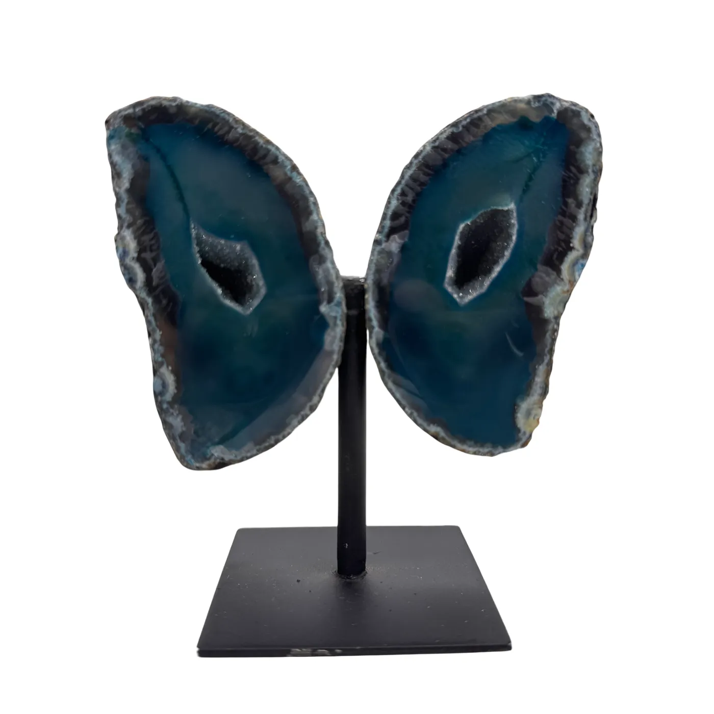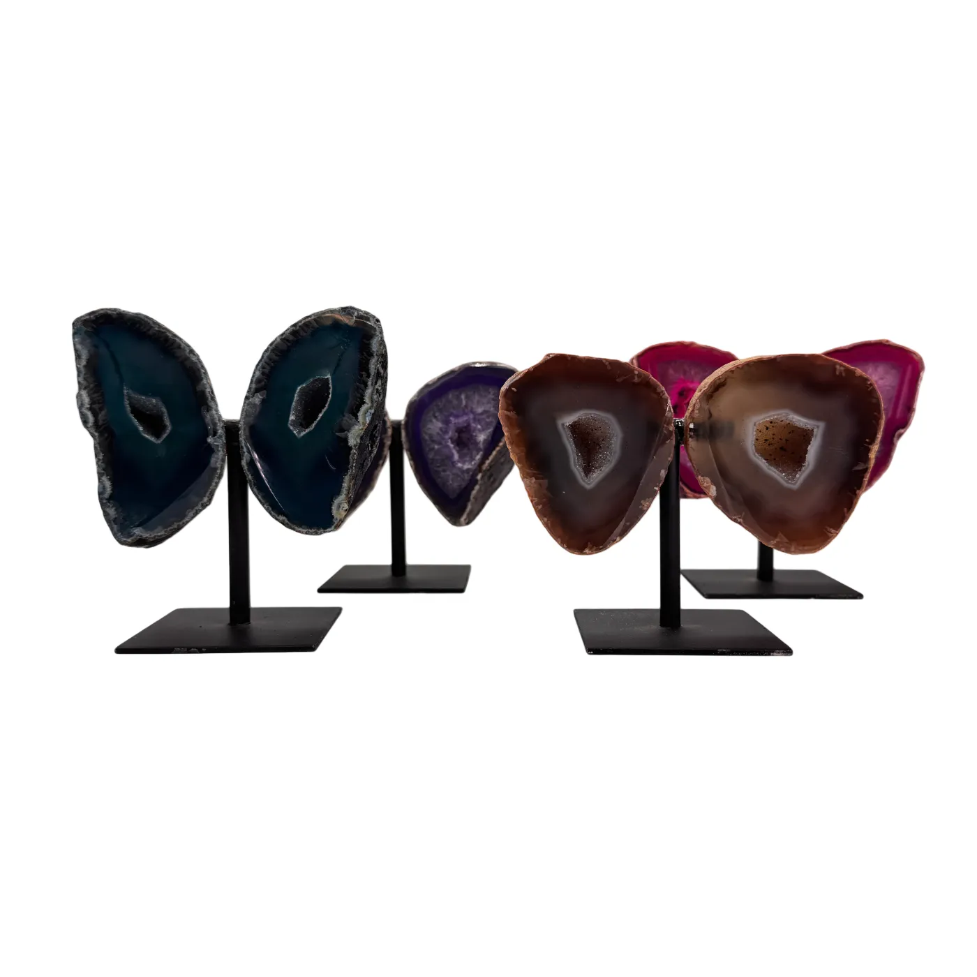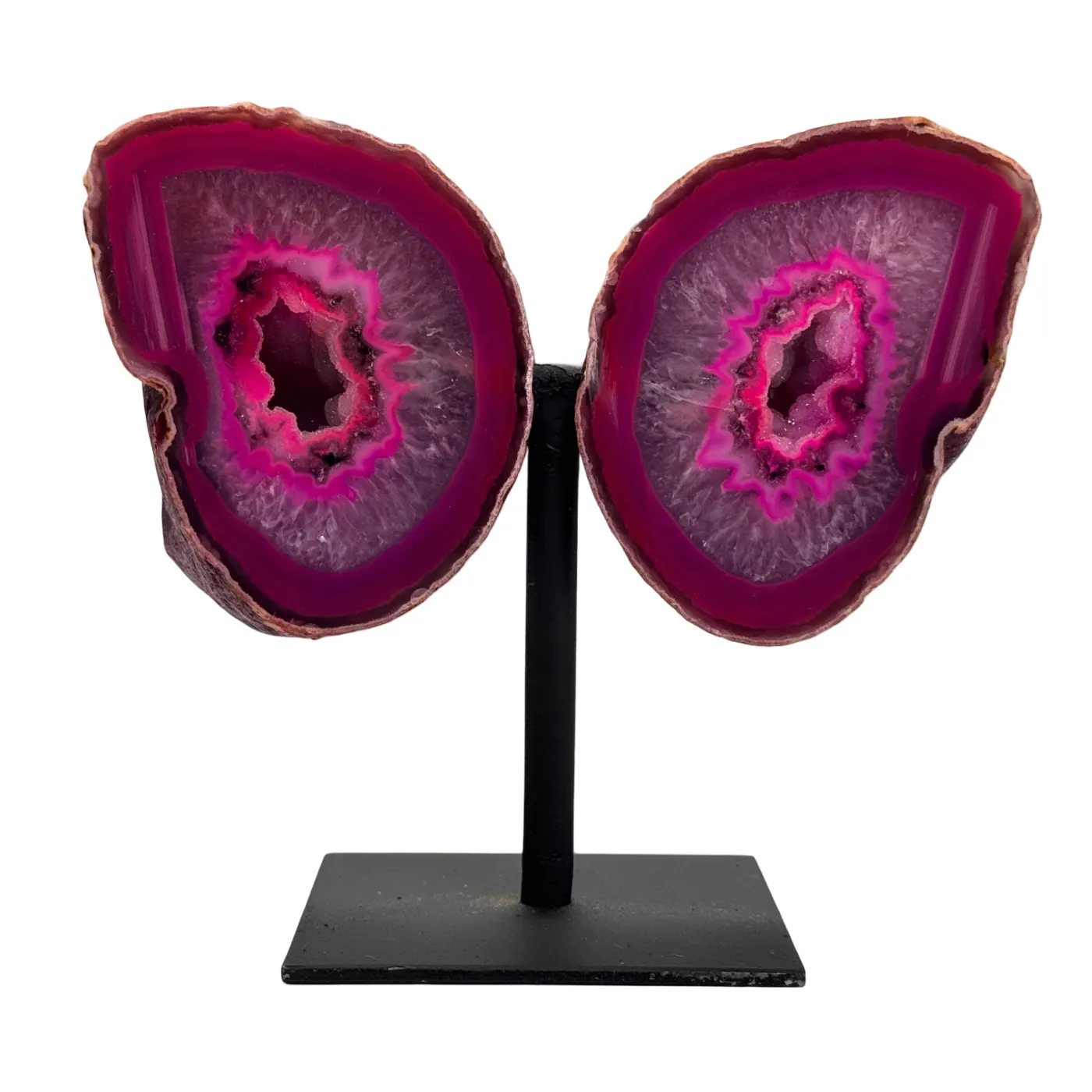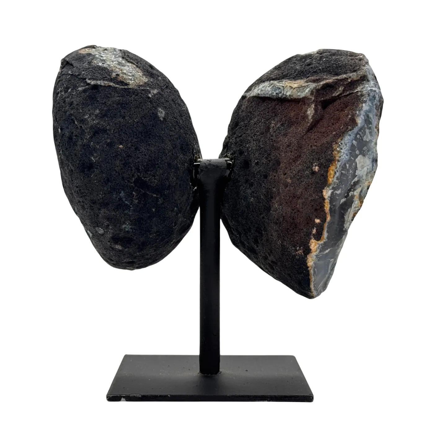 Agaat geode op zwarte metalen standaard. De geode bestaat uit één stuk steen dat doormidden is geslepen. Door beide helften naast elkaar te plaatsen ontstaat er een prachtig vlindereffect.