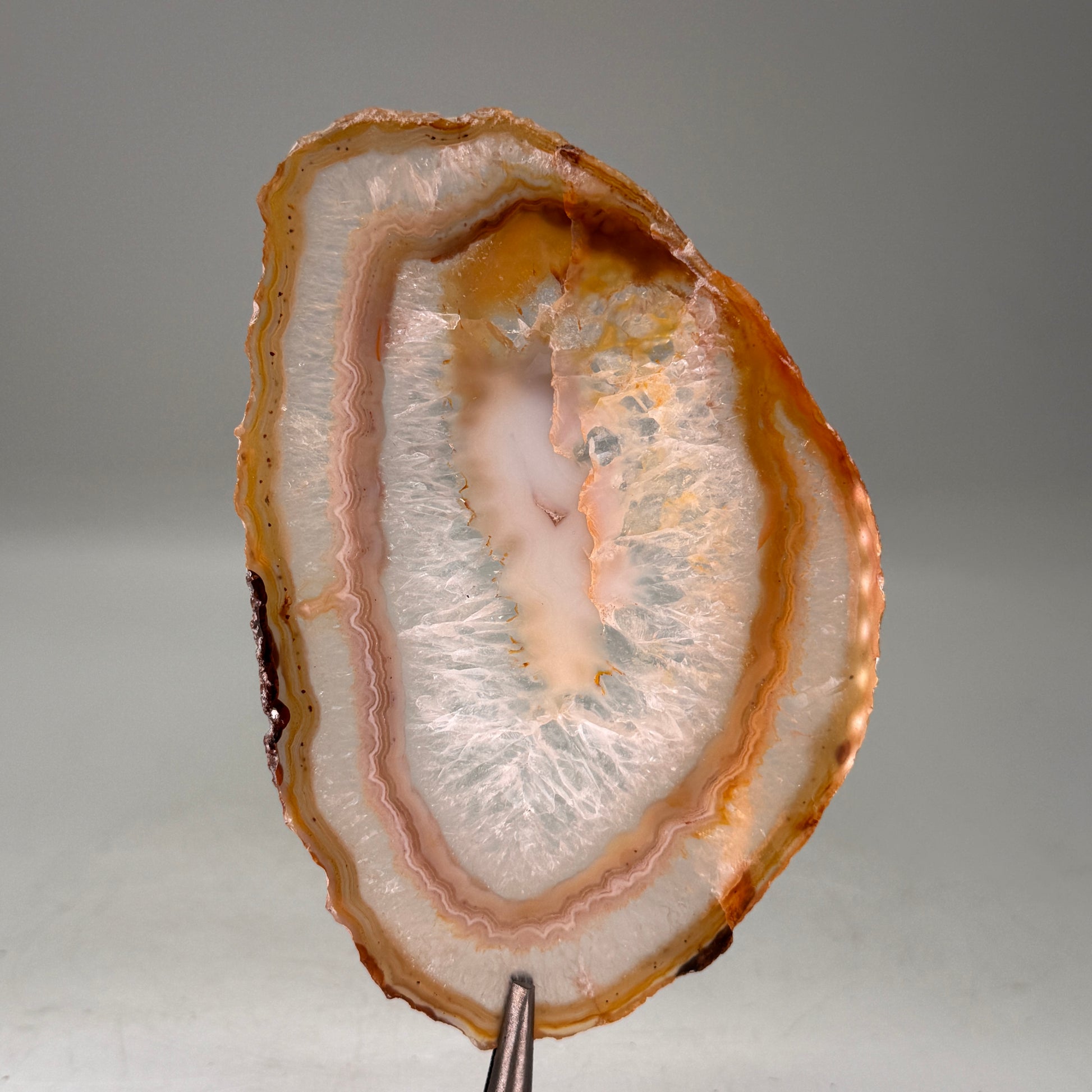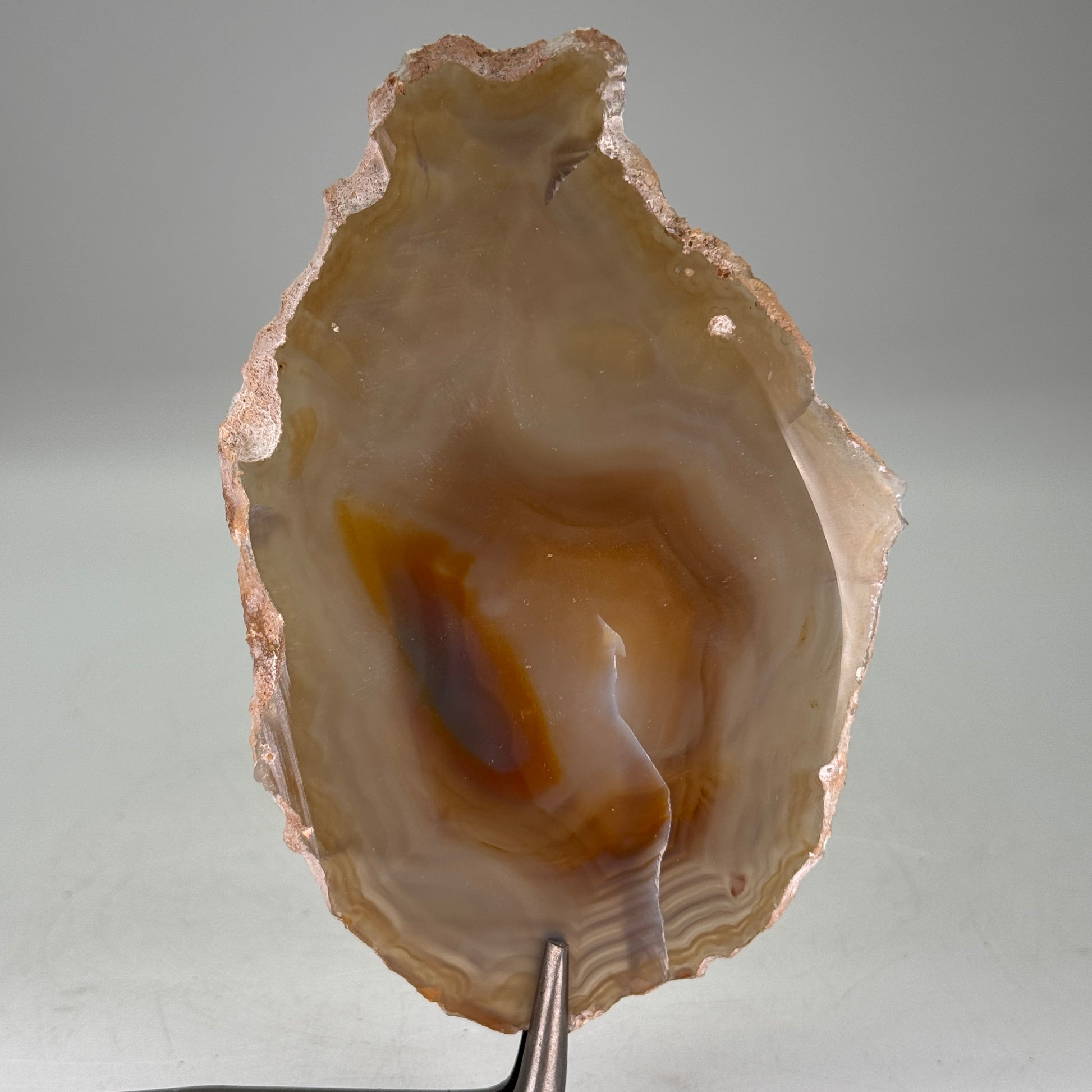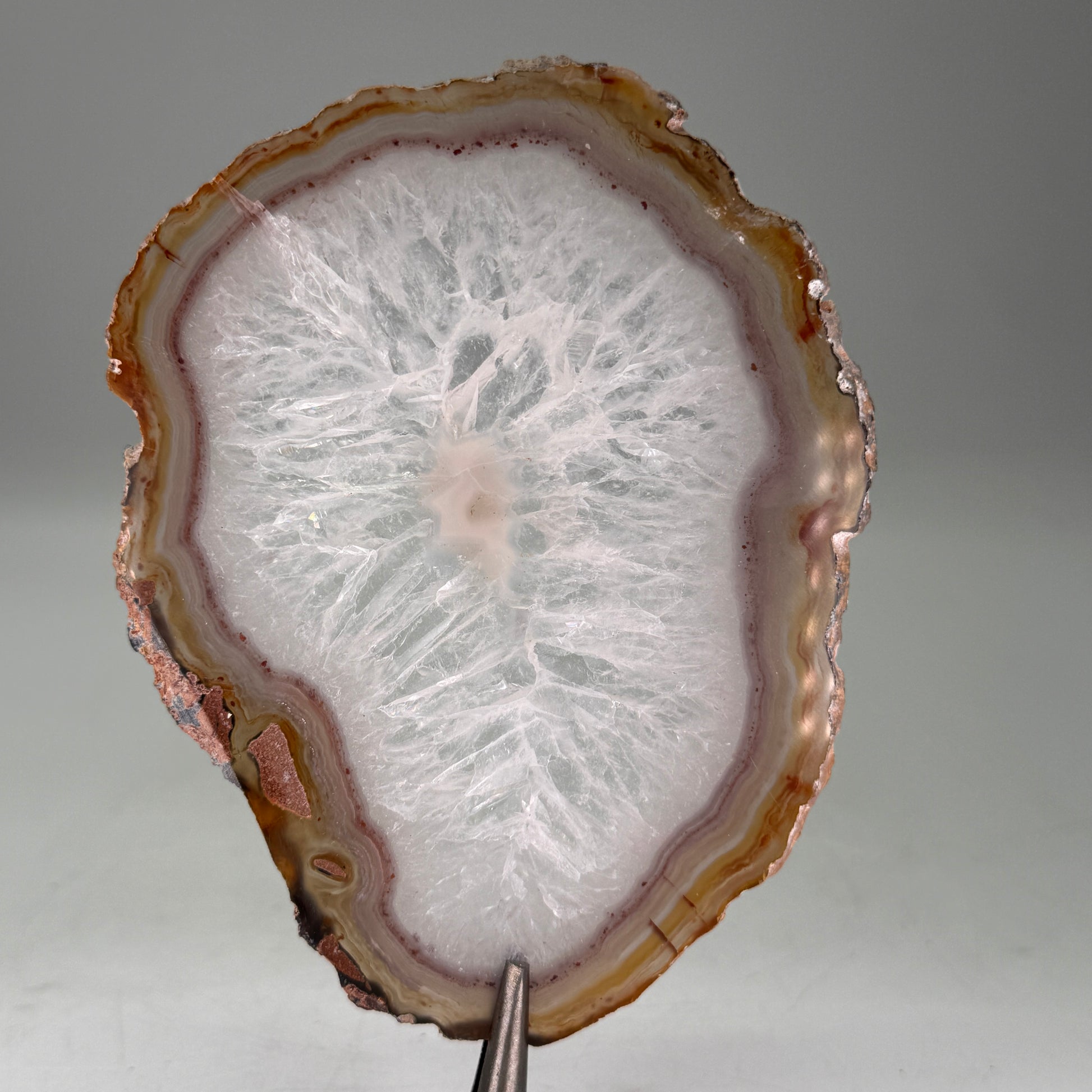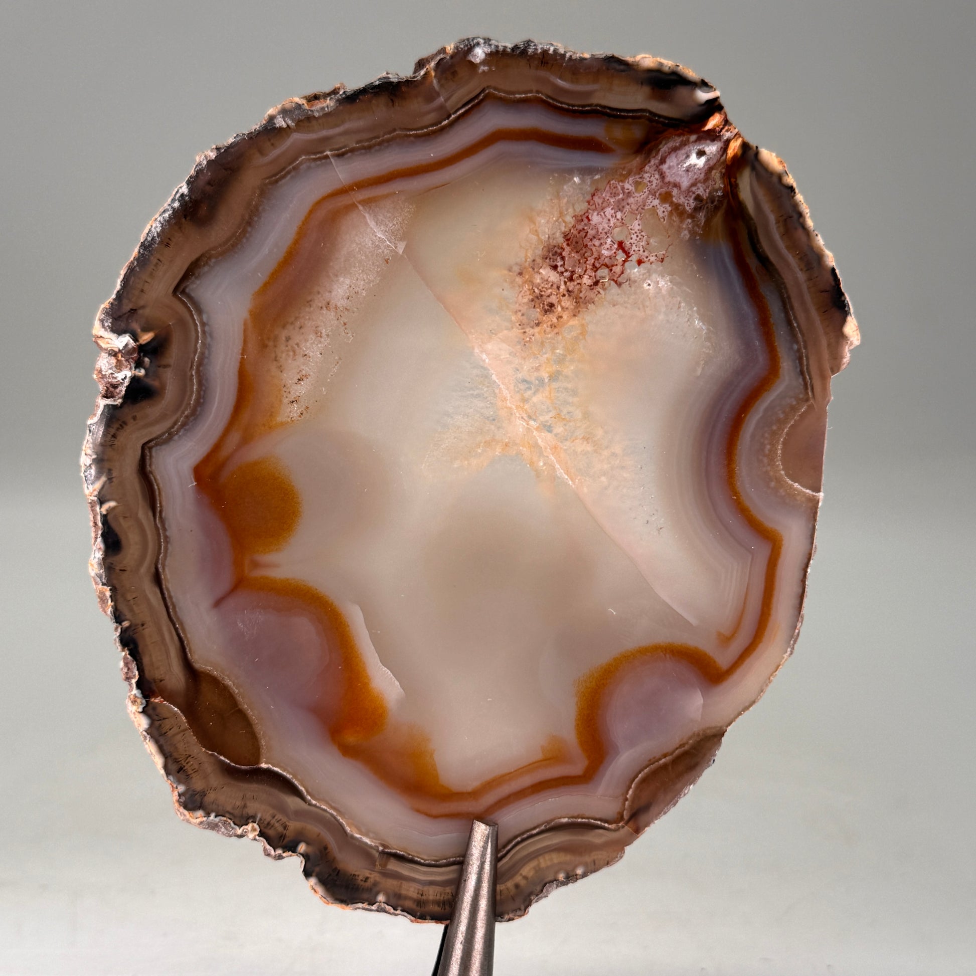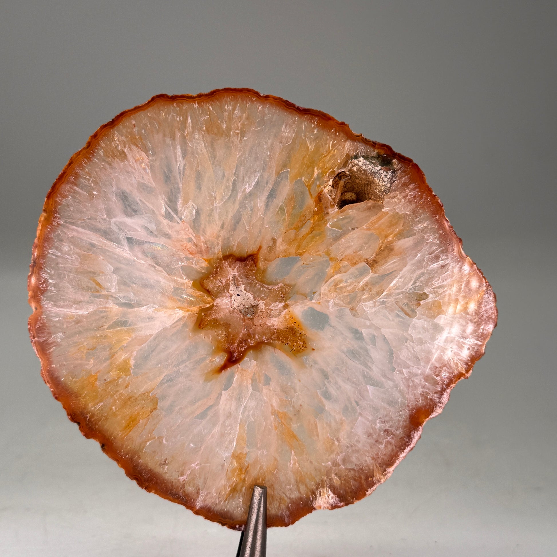 Dankzij de dikte van ca. 0,5 cm komt de agaat prachtig tot zijn recht wanneer je de schijf voor het licht houdt, de lijnen, patronen en kleuren worden dan extra helder zichtbaar.
