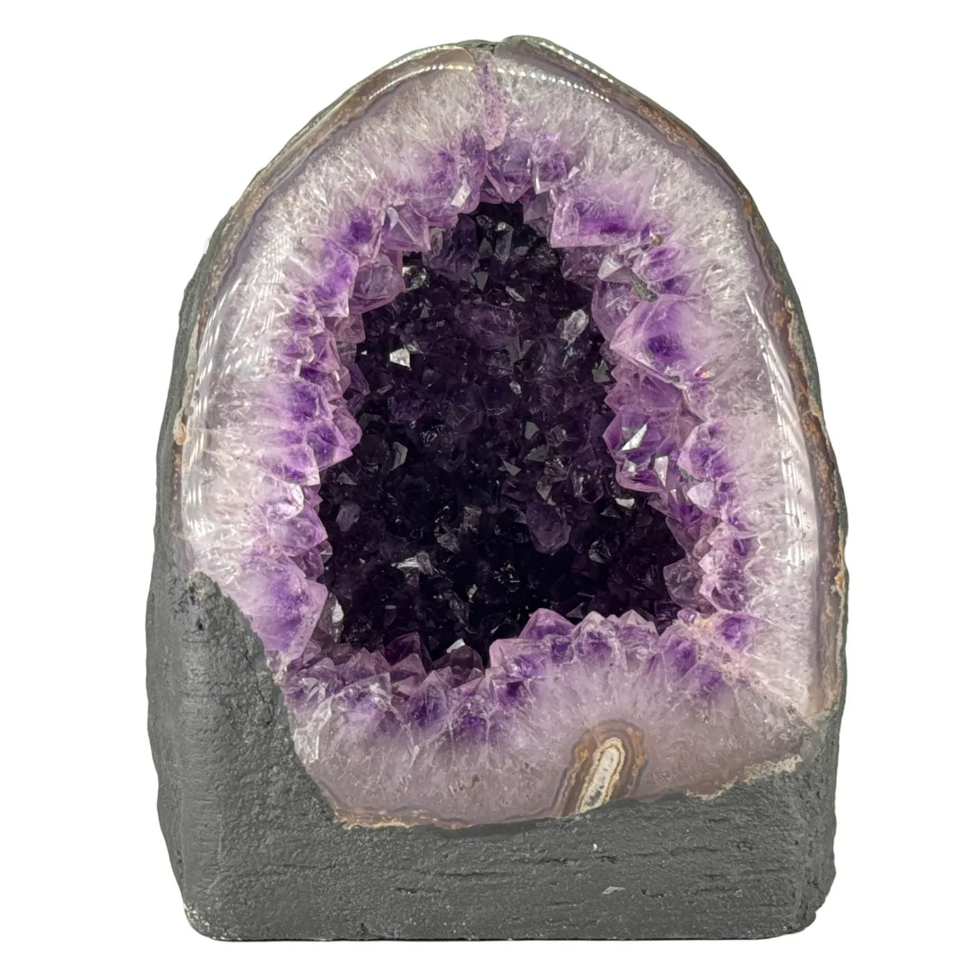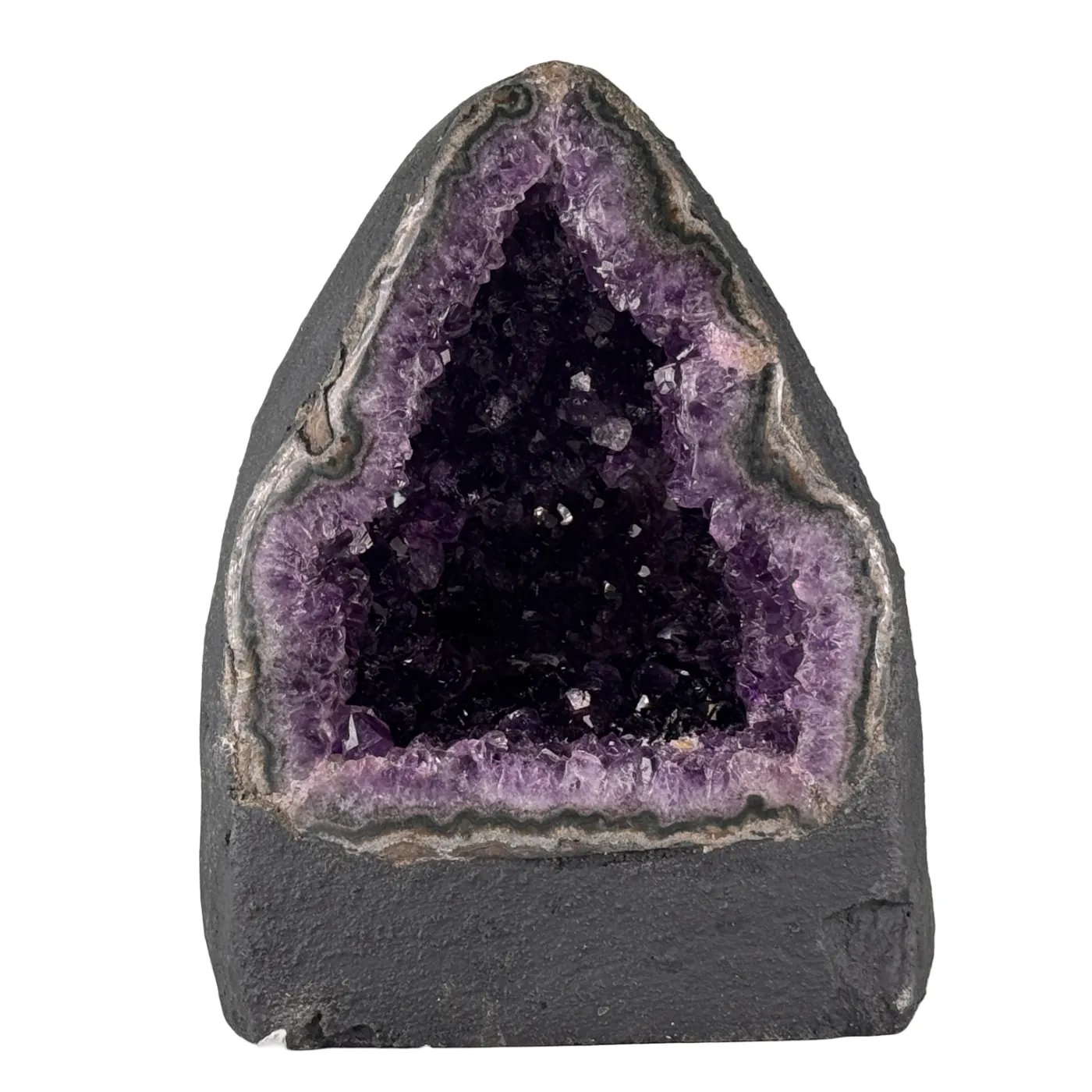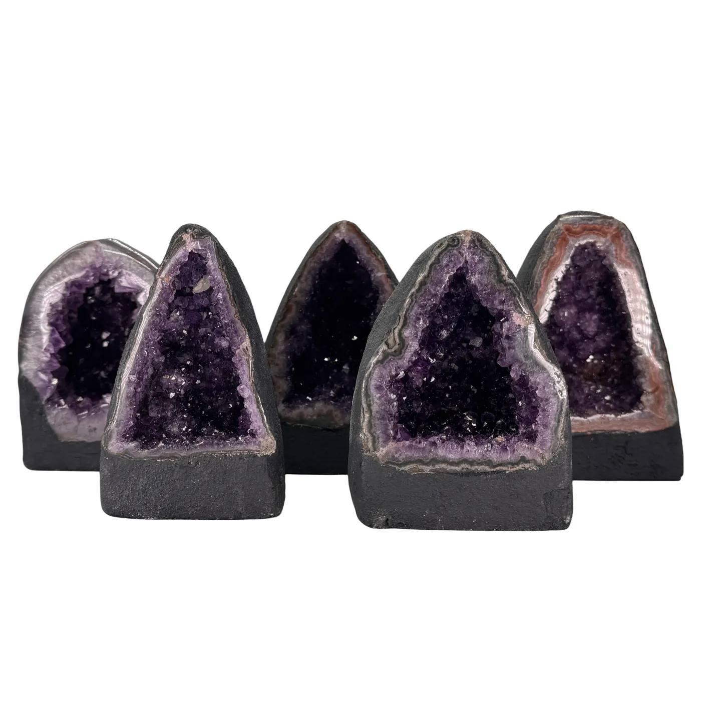 Prachtige collectie kleine amethist kathedralen van uitzonderlijke kwaliteit. Elke geode is afkomstig uit Brazilië en heeft een diep donkerpaarse kleur die direct opvalt. De glinsterende kristallen en natuurlijke vormen maken elk stuk uniek en sfeervol.
