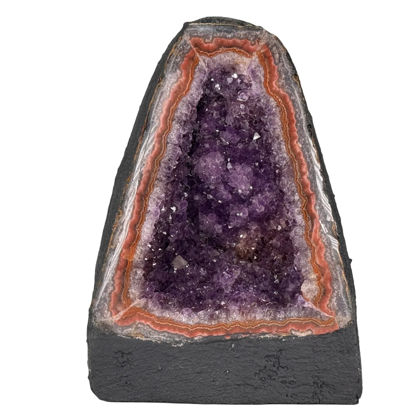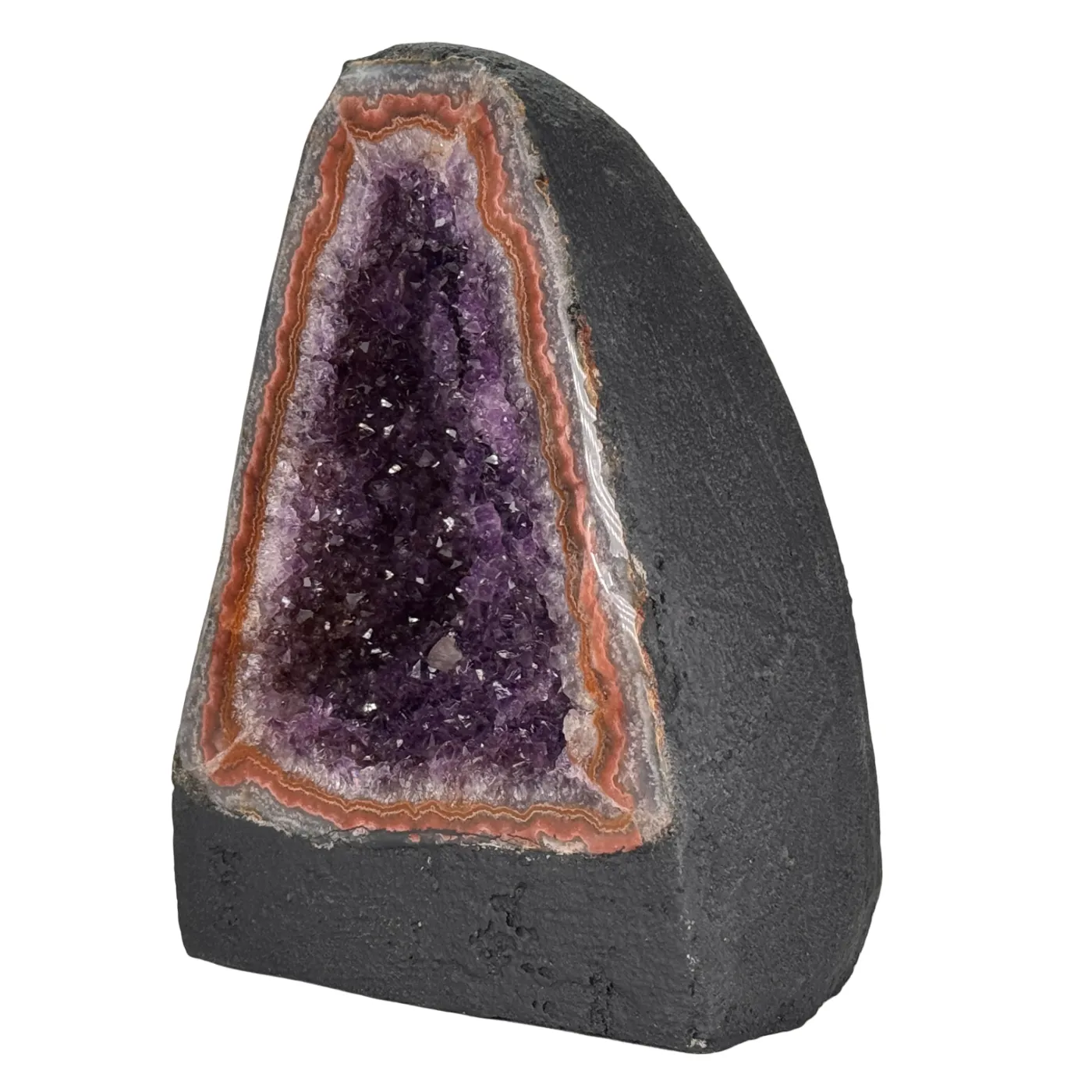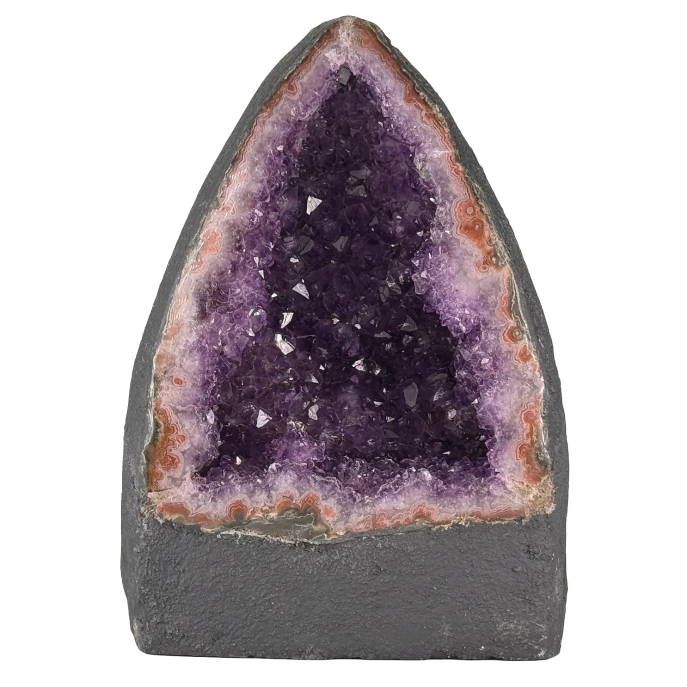 Prachtige collectie kleine amethist kathedralen van uitzonderlijke kwaliteit. Elke geode is afkomstig uit Brazilië en heeft een diep donkerpaarse kleur die direct opvalt. De glinsterende kristallen en natuurlijke vormen maken elk stuk uniek en sfeervol.