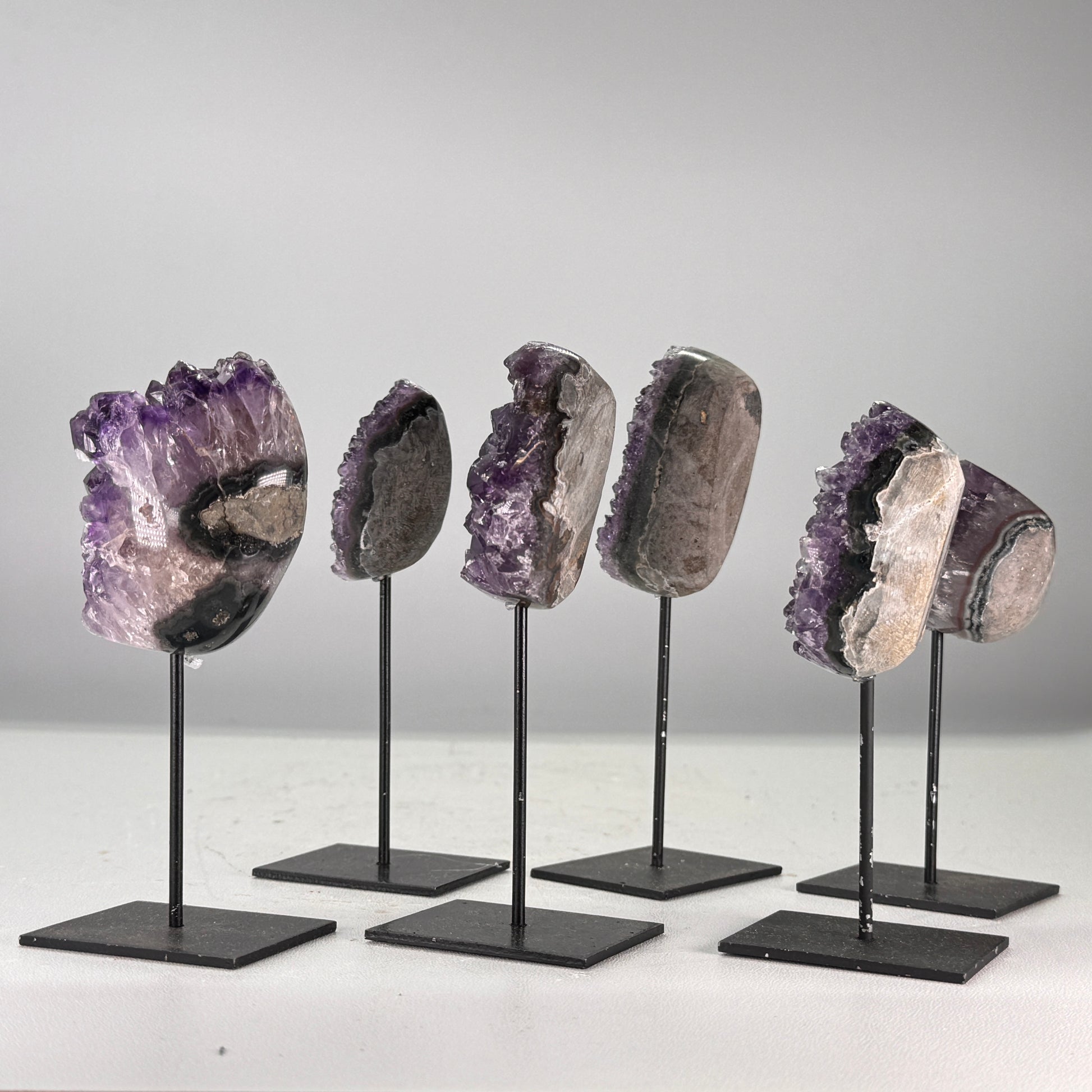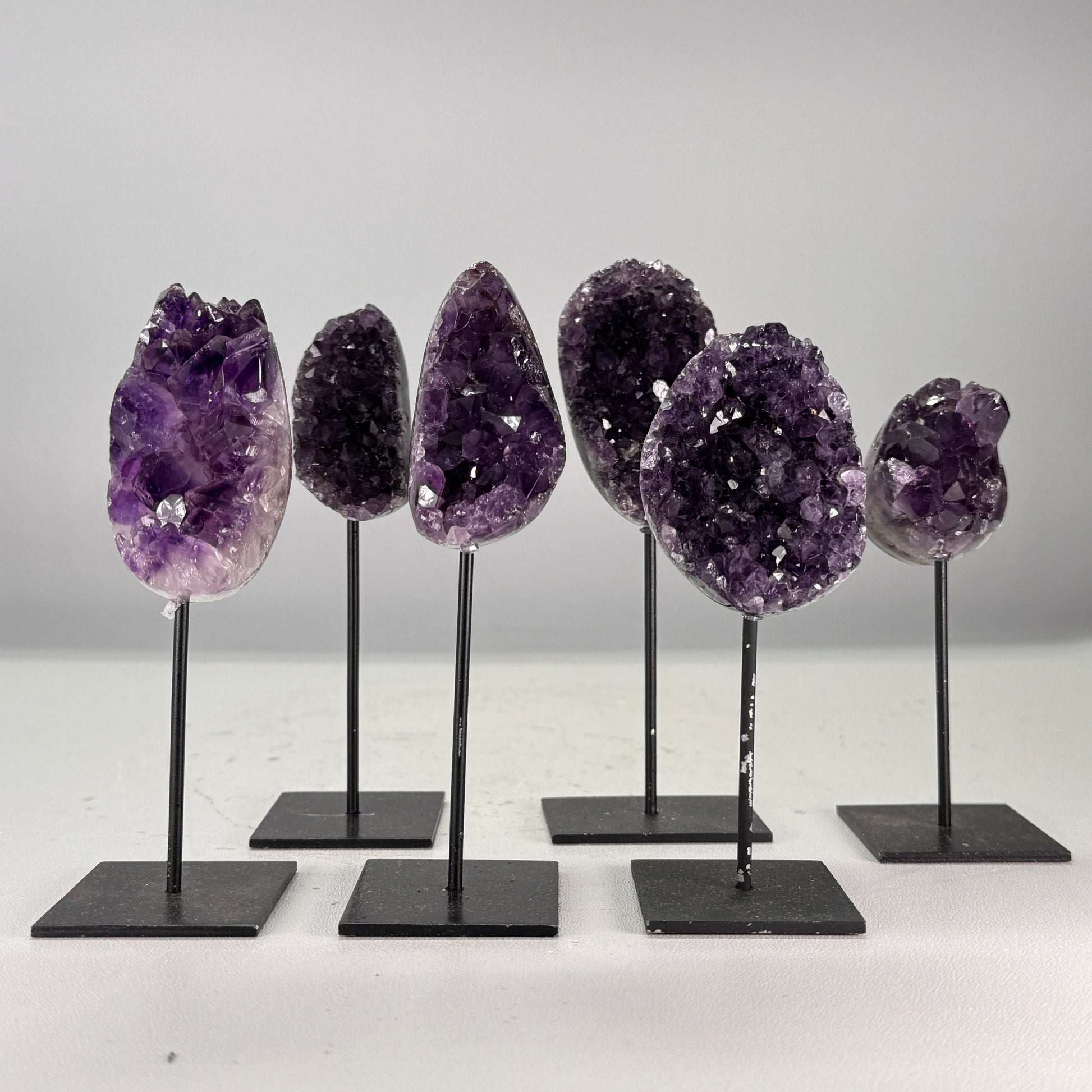 Prachtige kleine amethist van hoge kwaliteit, rondom gepolijst en geplaatst op een zwarte gecoate metalen standaard. De steen heeft een diep donkerpaarse kleur.