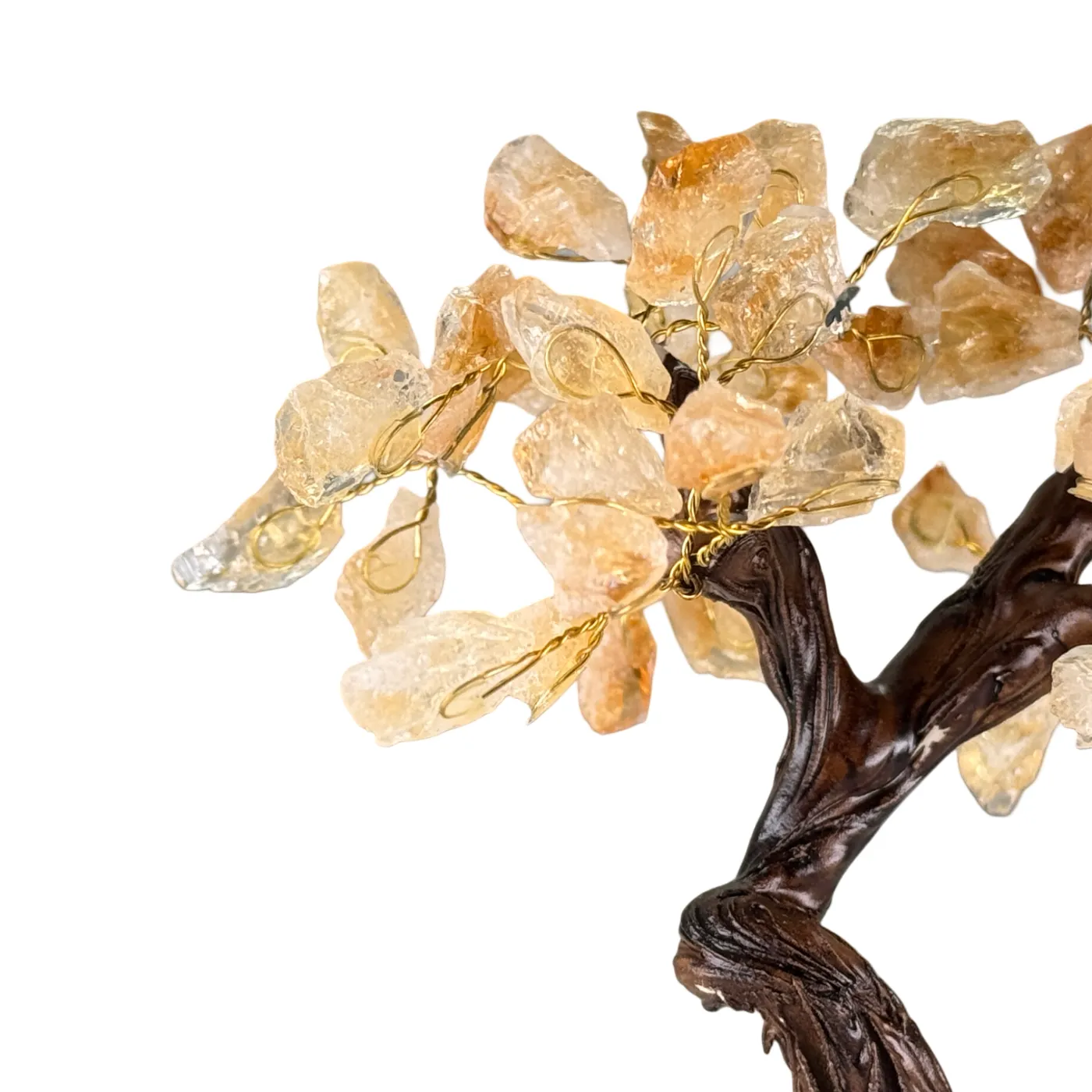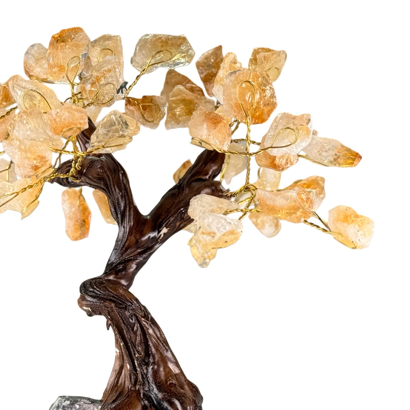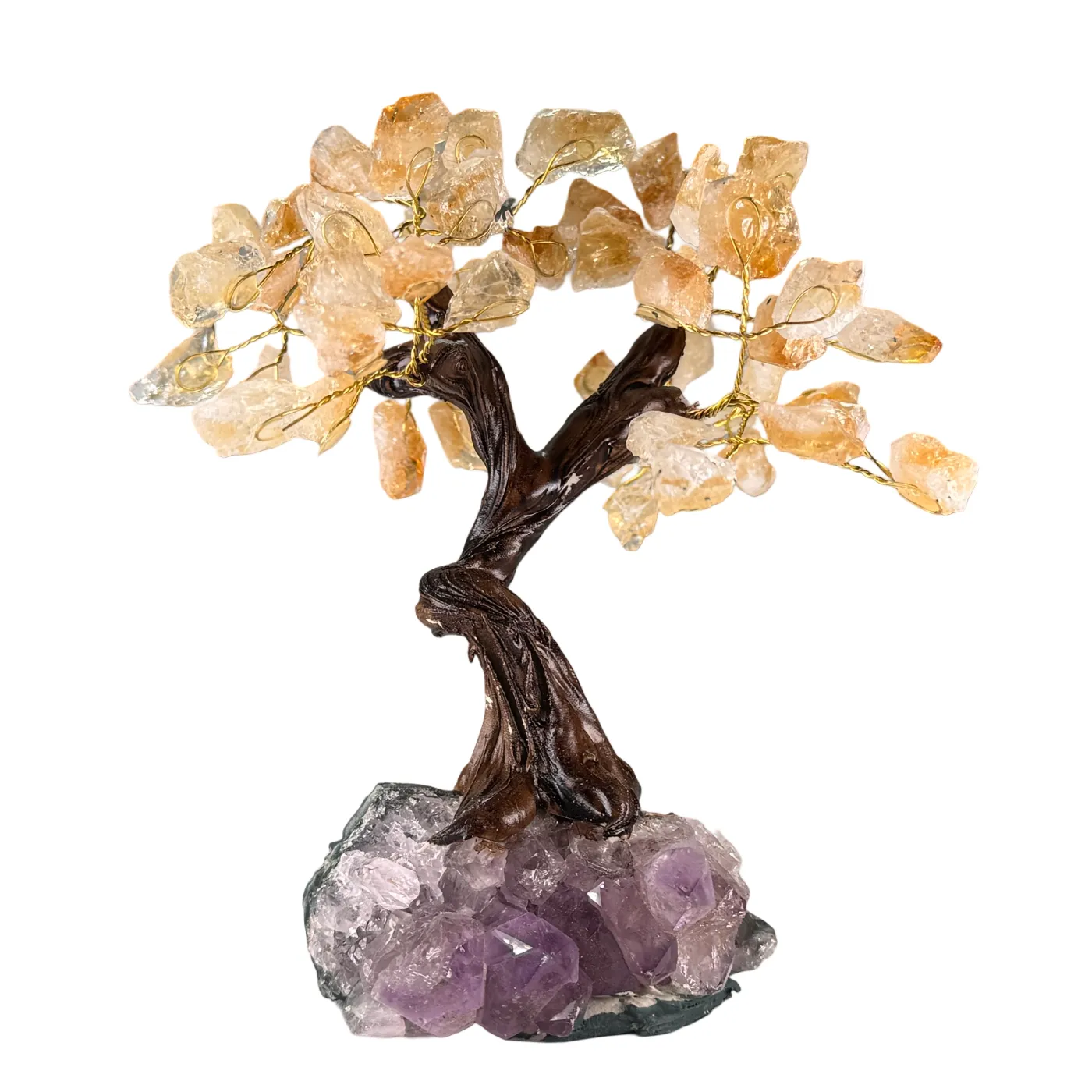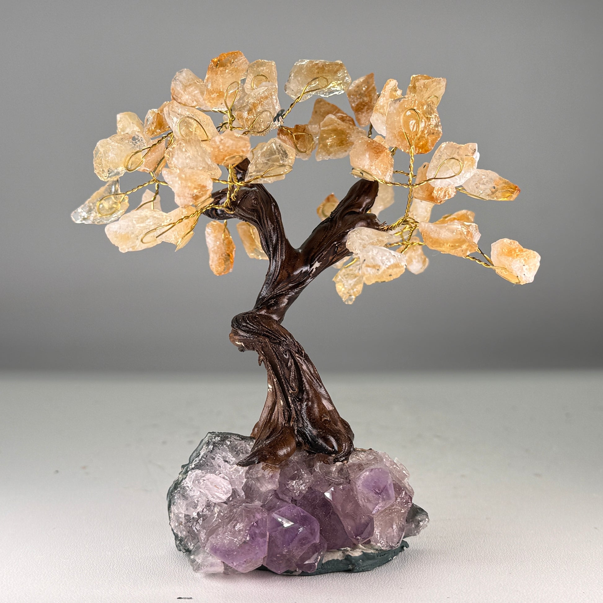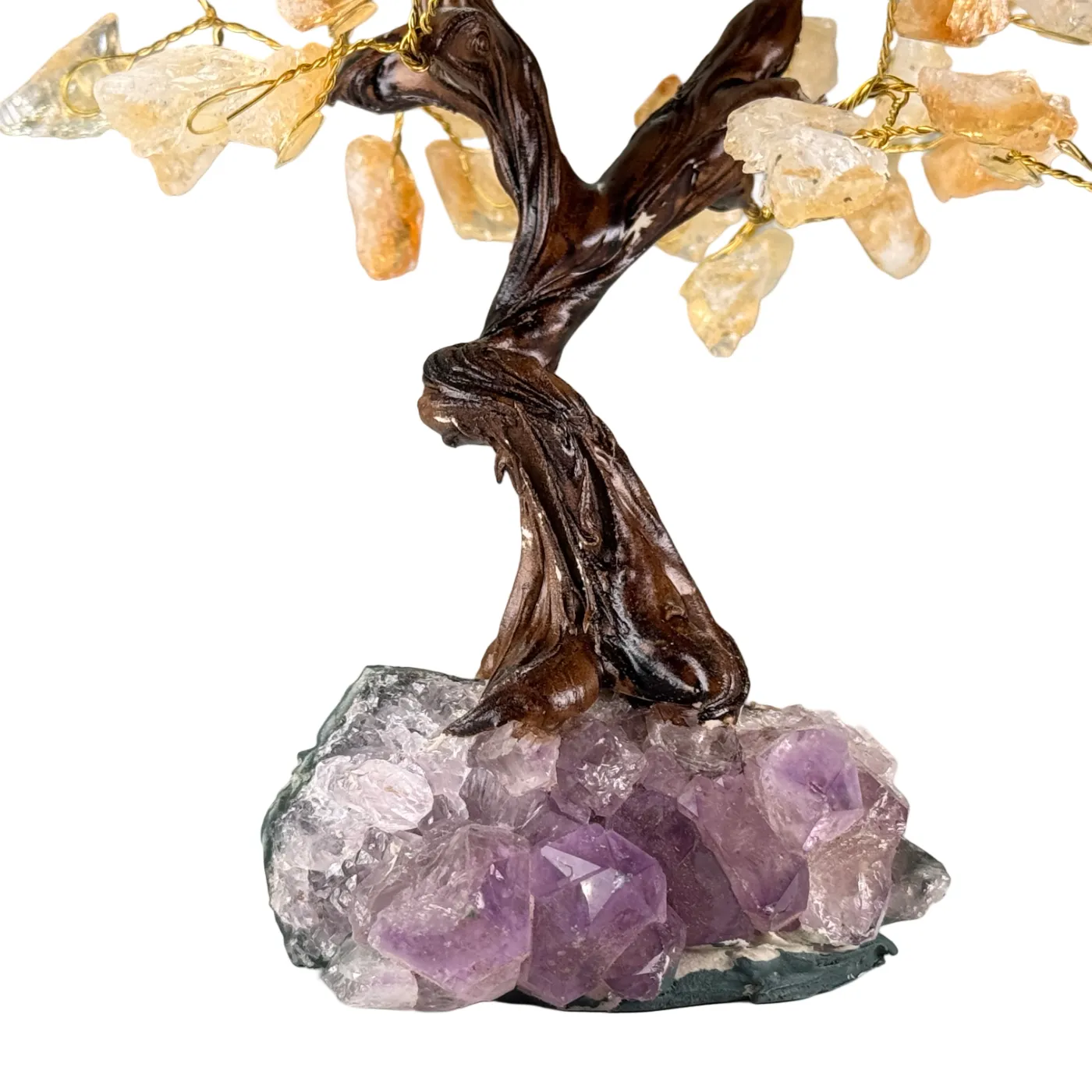 Prachtig handgemaakt edelsteenboompje met ruwe citrienbladeren, geplaatst op een natuurlijke amethist cluster. Elk stuk is uniek dankzij het ambachtelijke vakmanschap en de natuurlijke variaties in kleur en vorm.