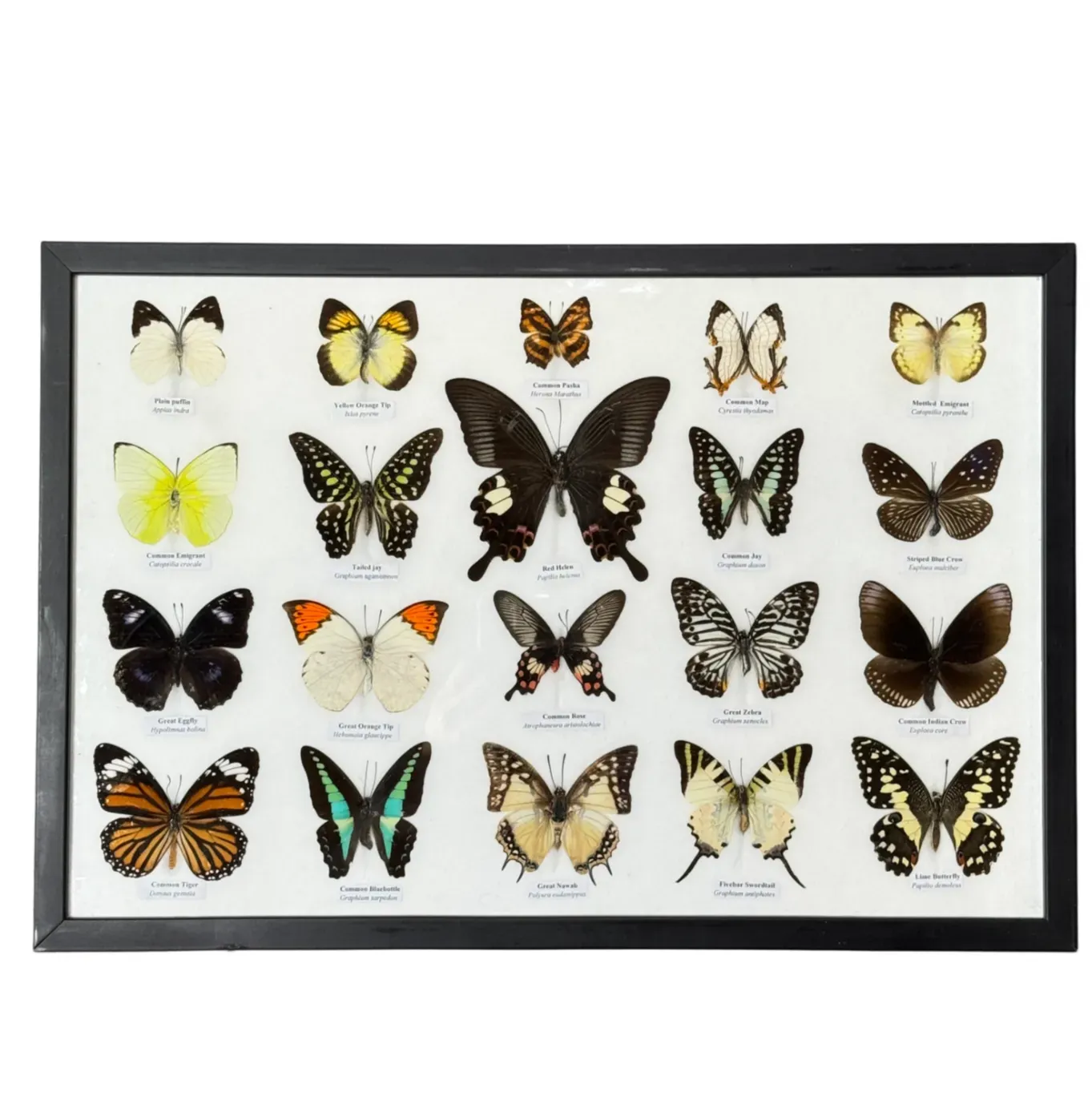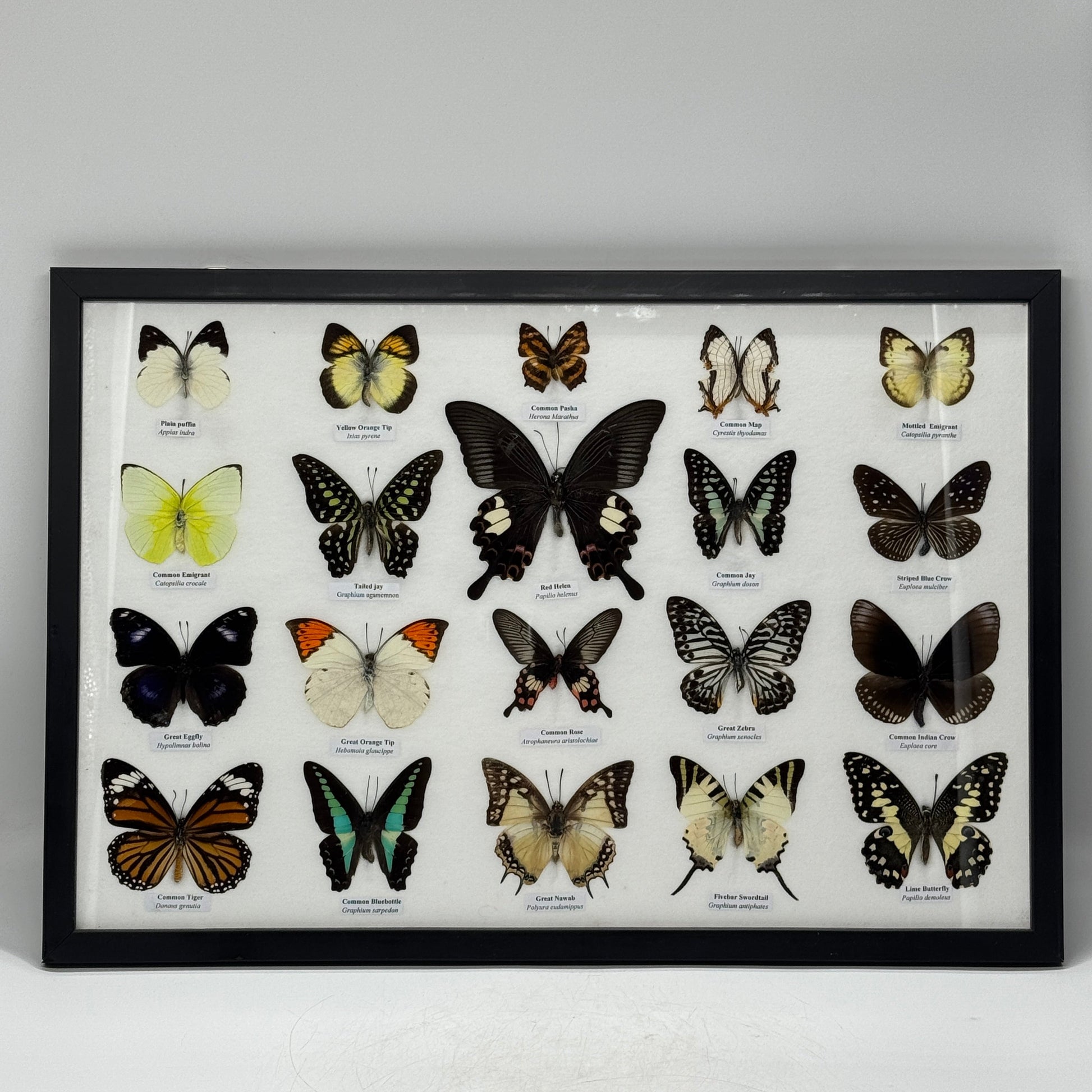 Deze lijst bevat 20 verschillende opgezette vlinders. De Papilio helenus (de grote vlinder) is altijd inbegrepen; de overige 19 soorten kunnen afwijken van de productfoto. Elke vlinder is voorzien van een naamlabel.