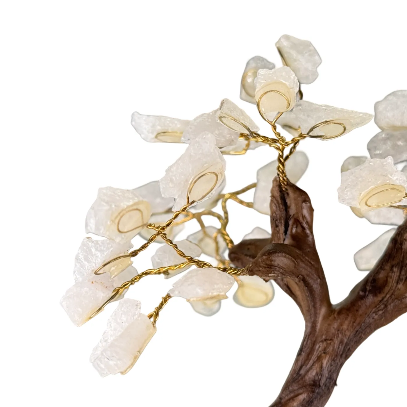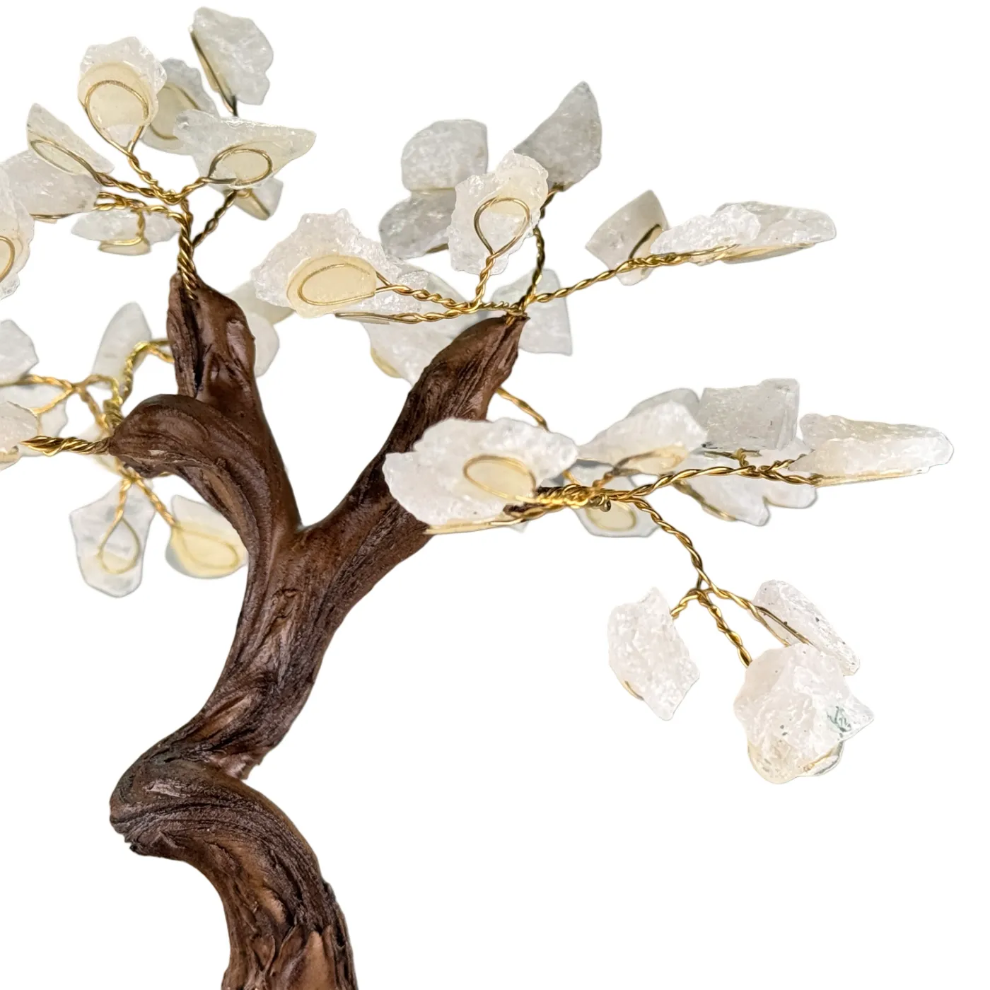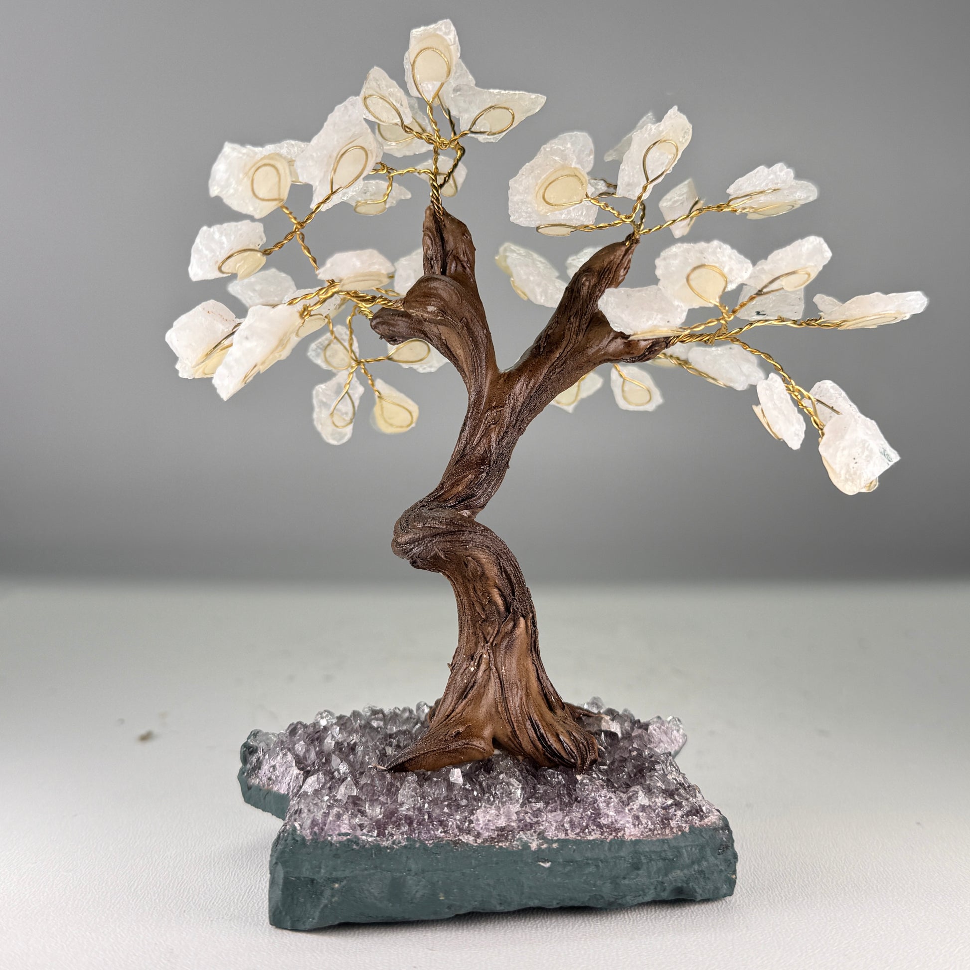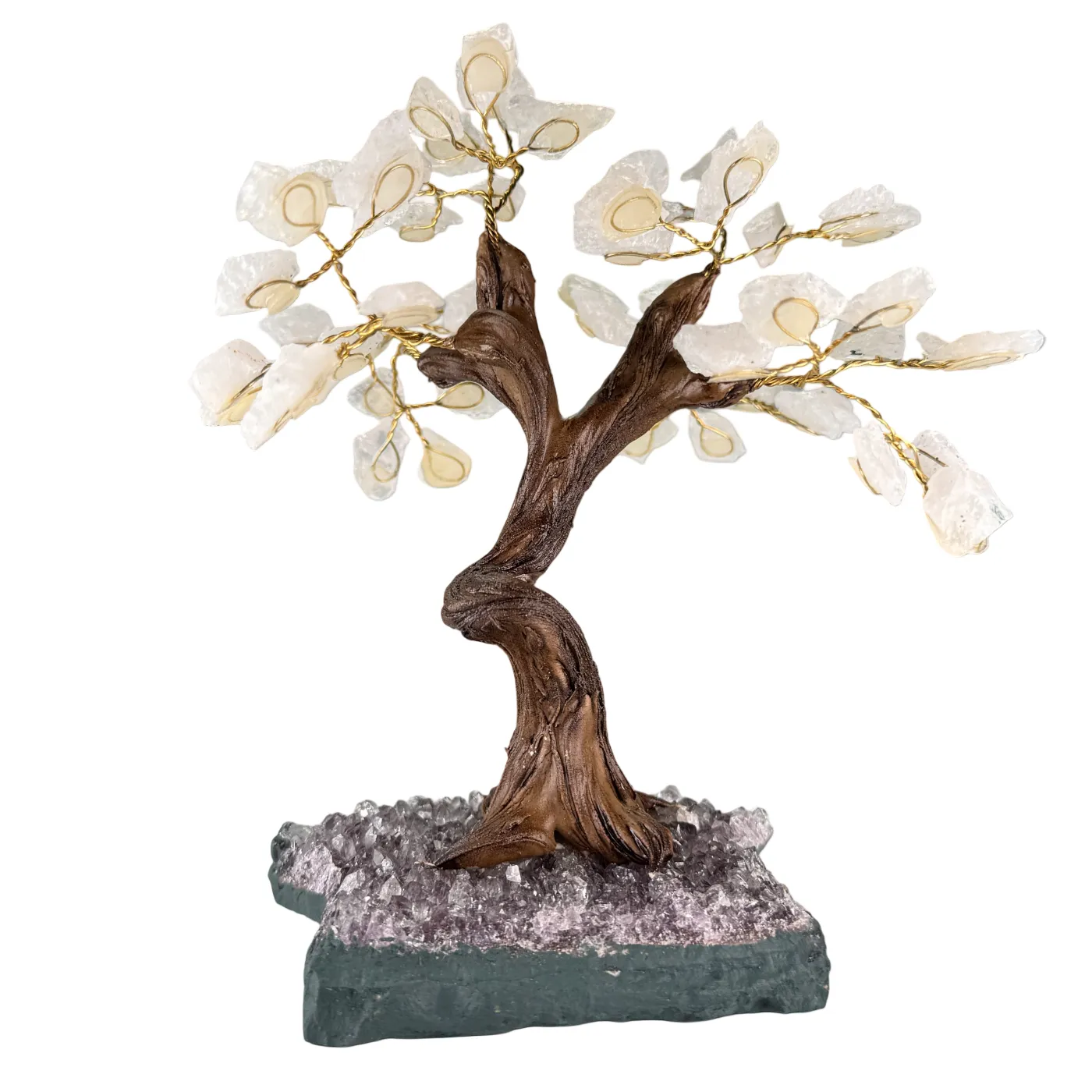 Prachtig handgemaakt edelsteenboompje met ruwe bergkristalbladeren, geplaatst op een natuurlijke amethist cluster. Elk stuk is uniek dankzij het ambachtelijke vakmanschap en de natuurlijke variaties van de stenen.