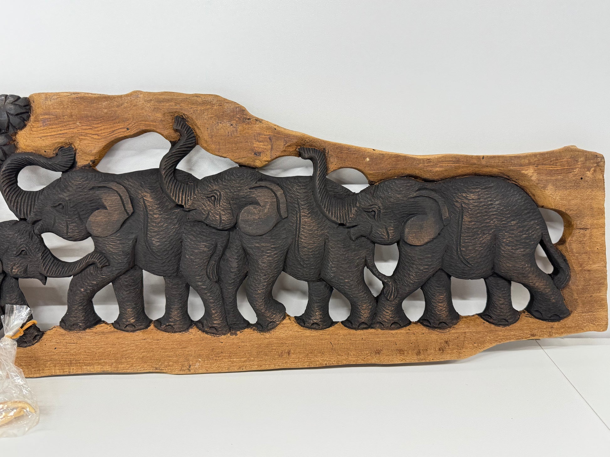 Handgemaakt houten paneel met vijf olifanten. De olifanten zijn voorzien van losse houten slagtanden die geplaatst kunnen worden voor een mooi 3D-effect. Elk paneel is volledig handgemaakt en daardoor uniek: kleur, vorm en details kunnen per stuk variëren.