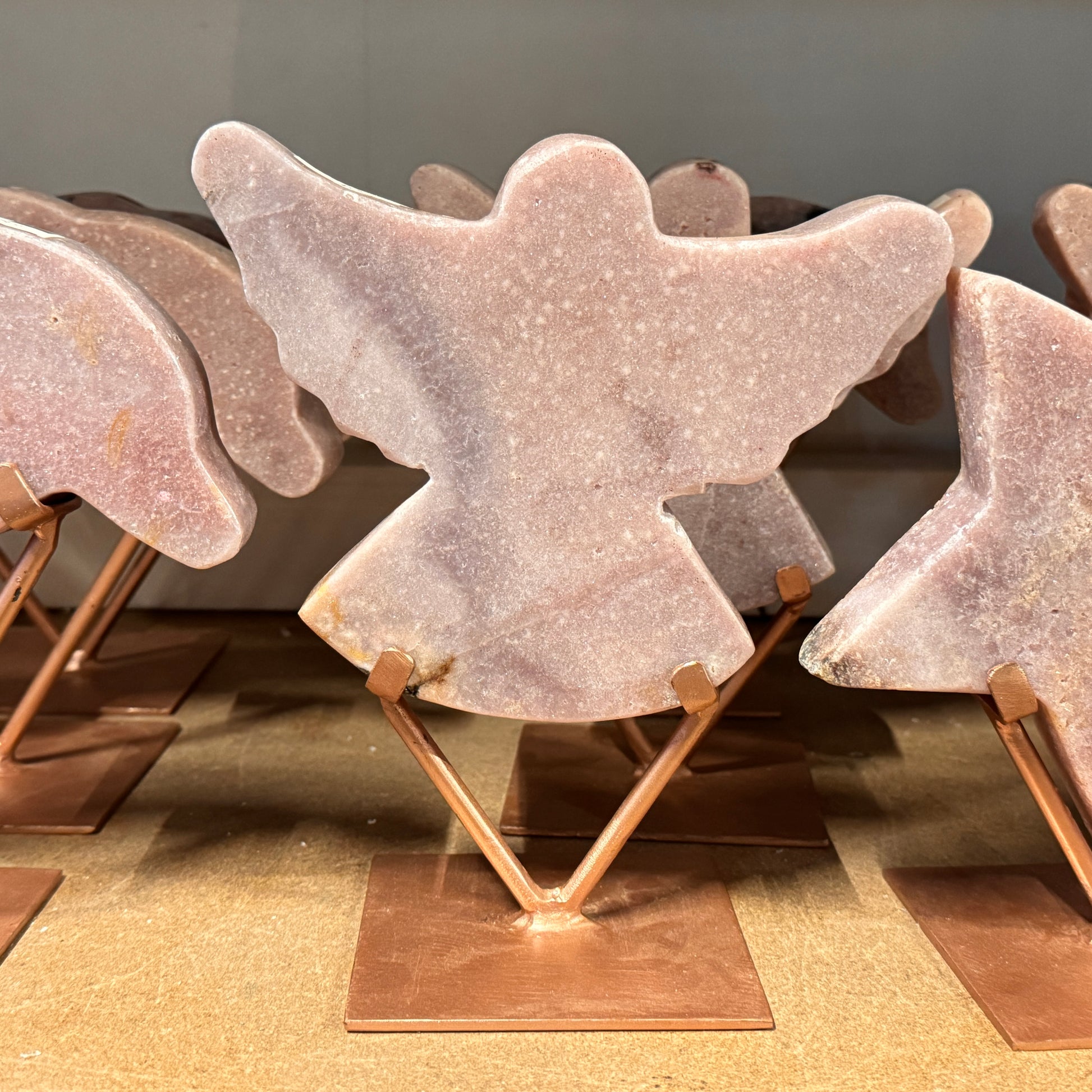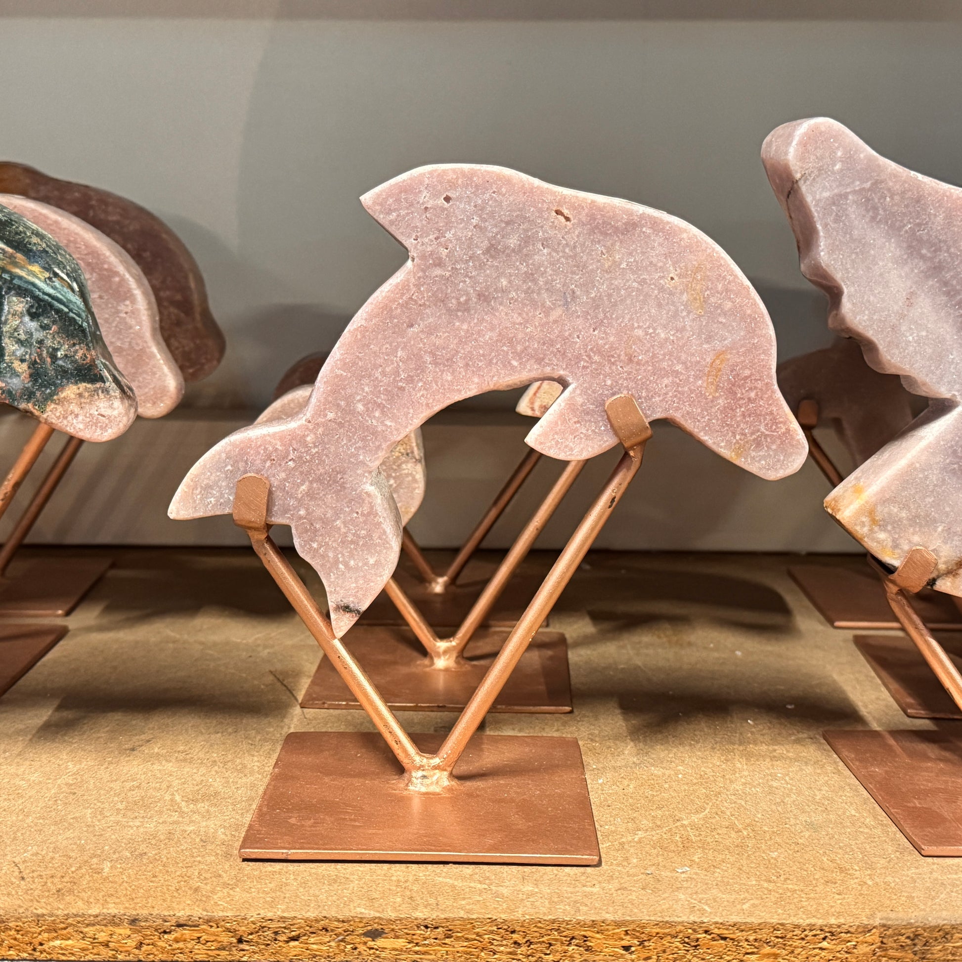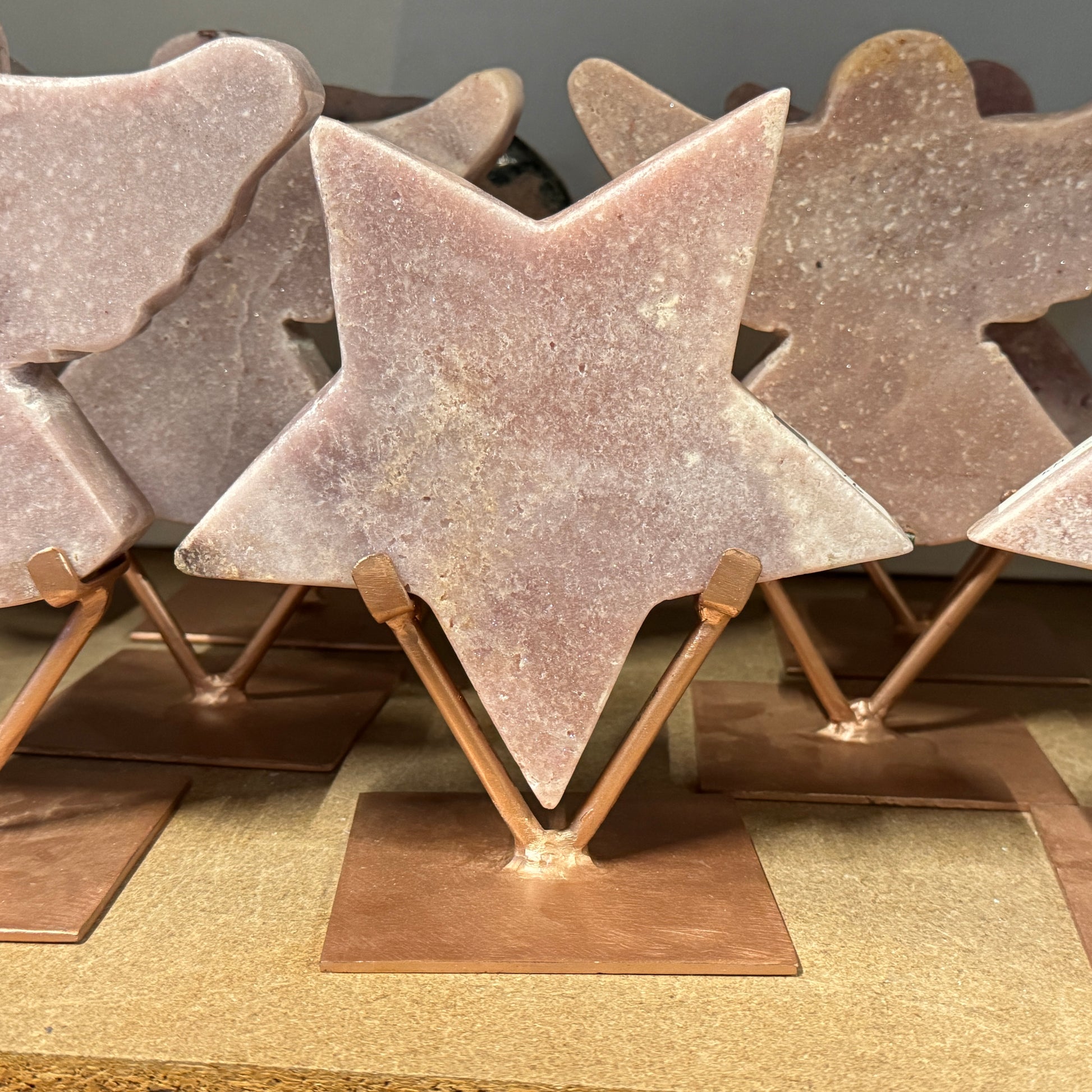 Roze amethist figuren op standaard. Er zijn drie soorten figuren, dolfijn, ster en engel. De roze amethist is gepolijst aan beide zijden en staat op een rosé kleurige metalen standaard. Het gewicht inclusief standaard is tussen de 0,9 en 1,3 kg.