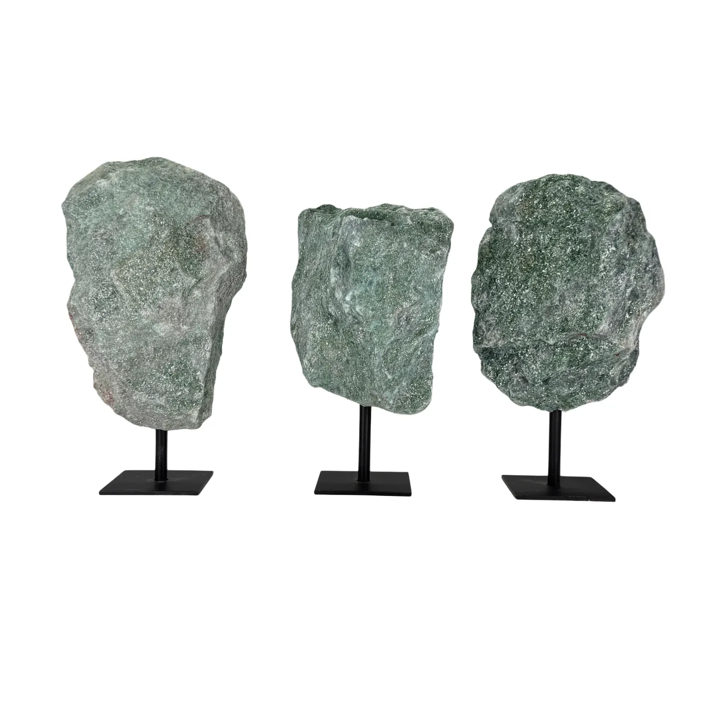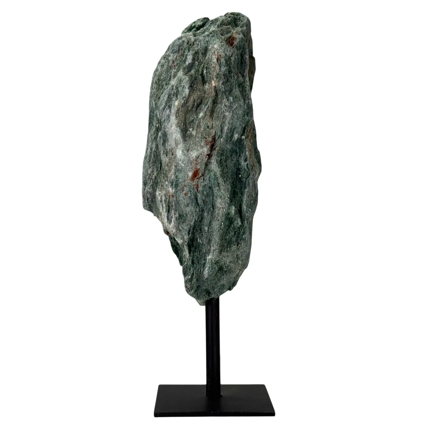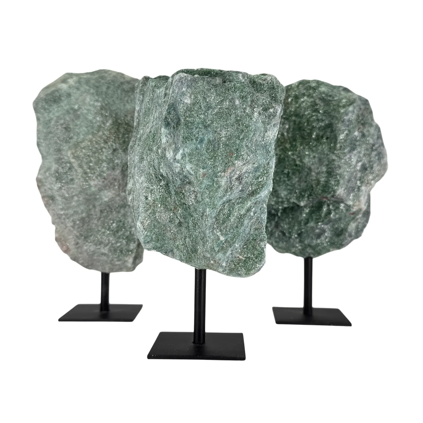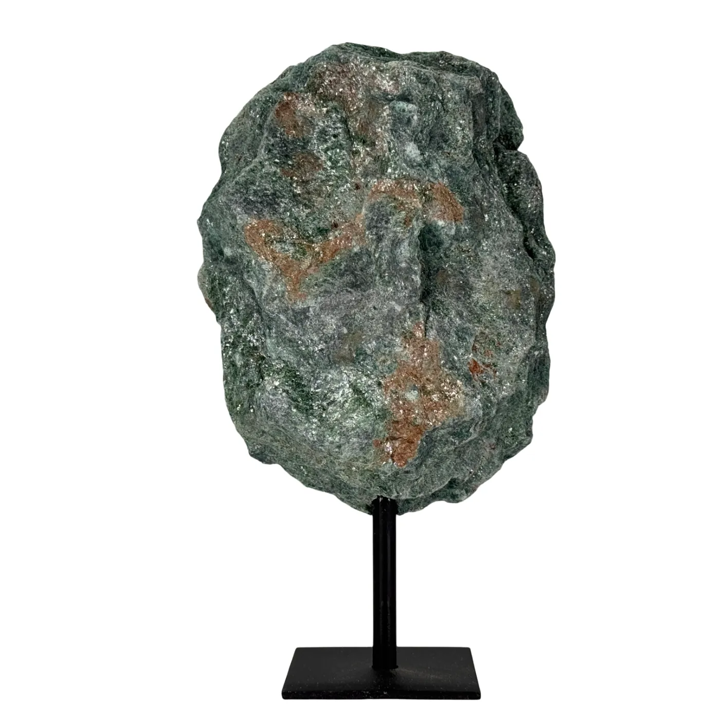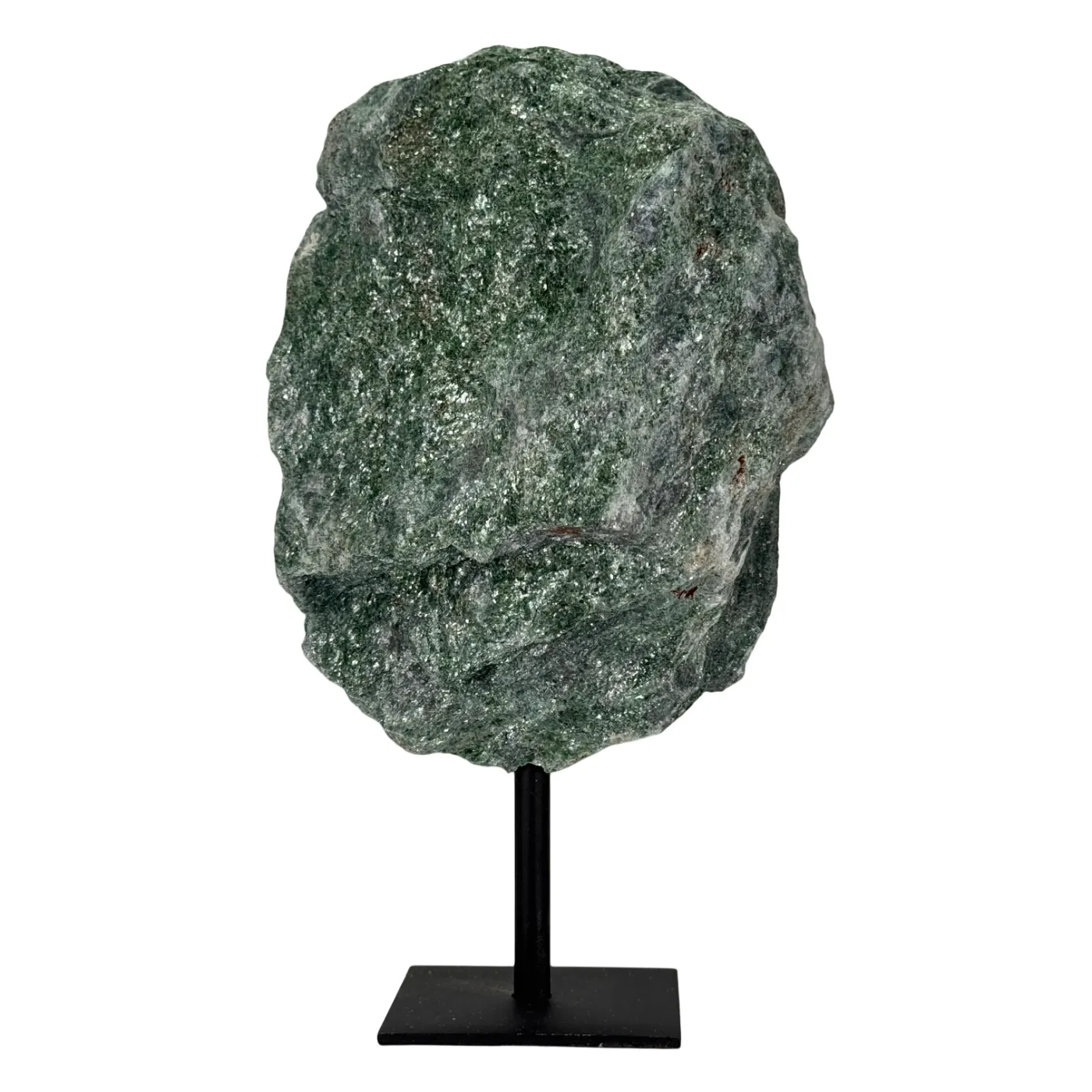 Ontdek de schittering van deze ruwe fuchsietsteen, rechtstreeks afkomstig uit Brazilië. De steen heeft een heldergroene glans met natuurlijke mica-reflecties en staat stevig op een elegante zwarte metalen standaard.