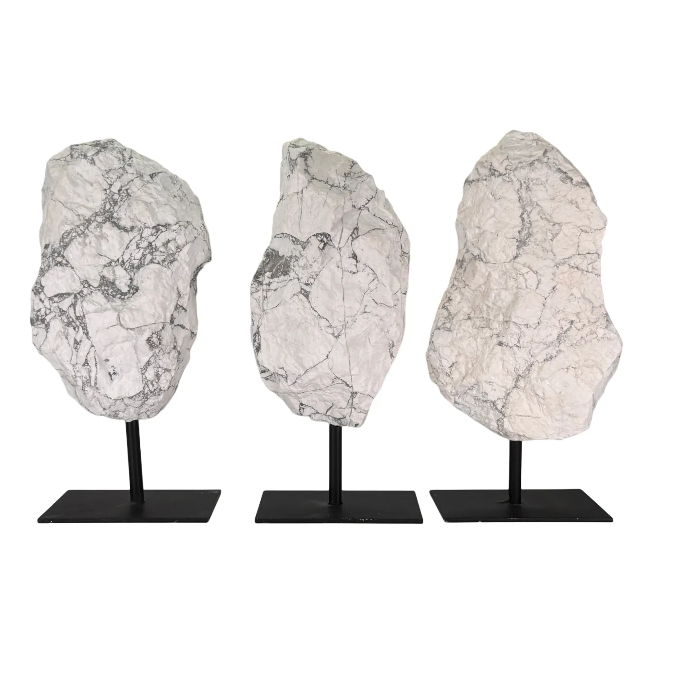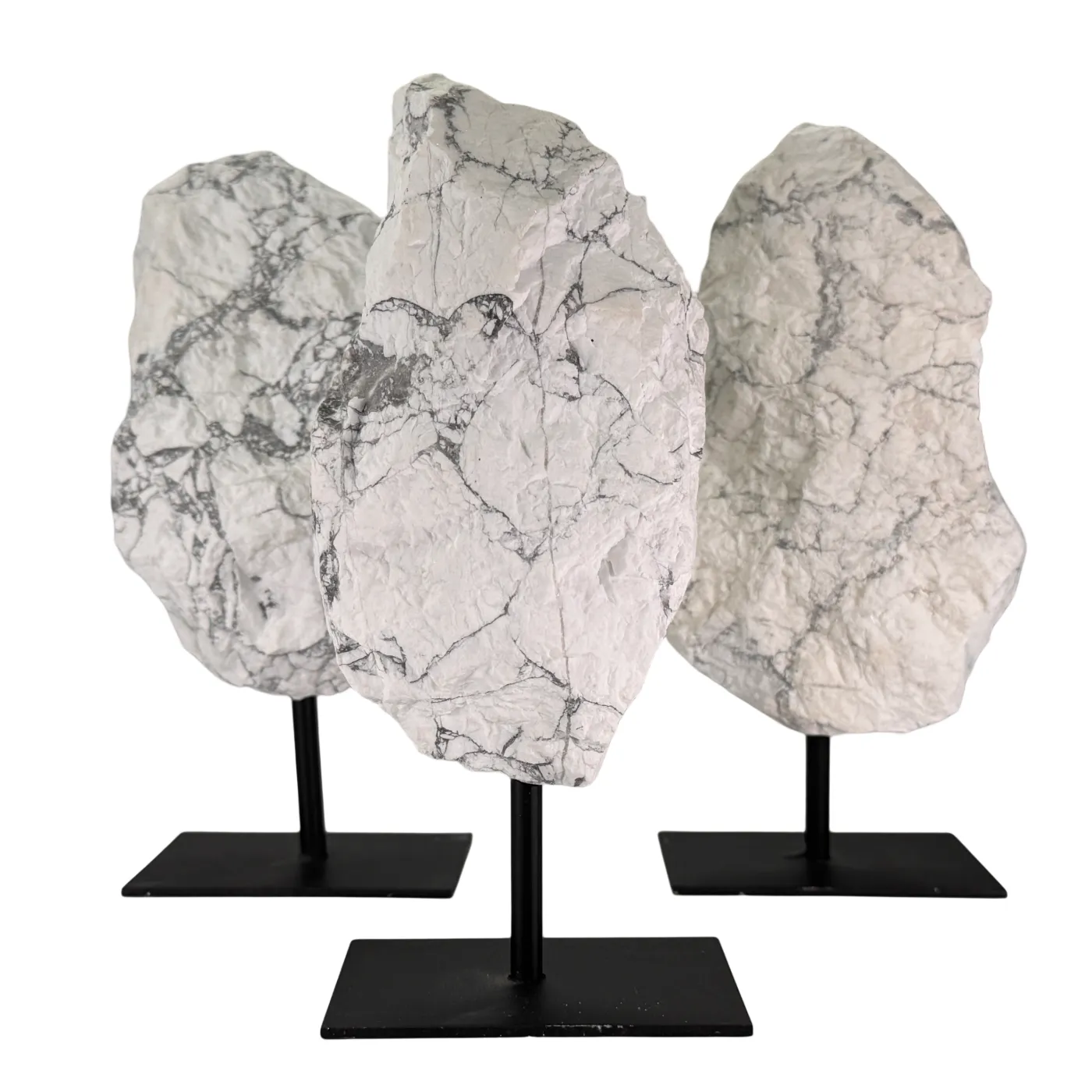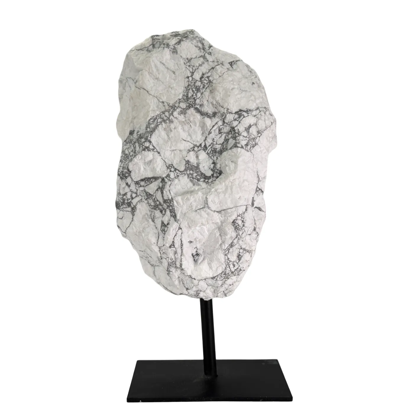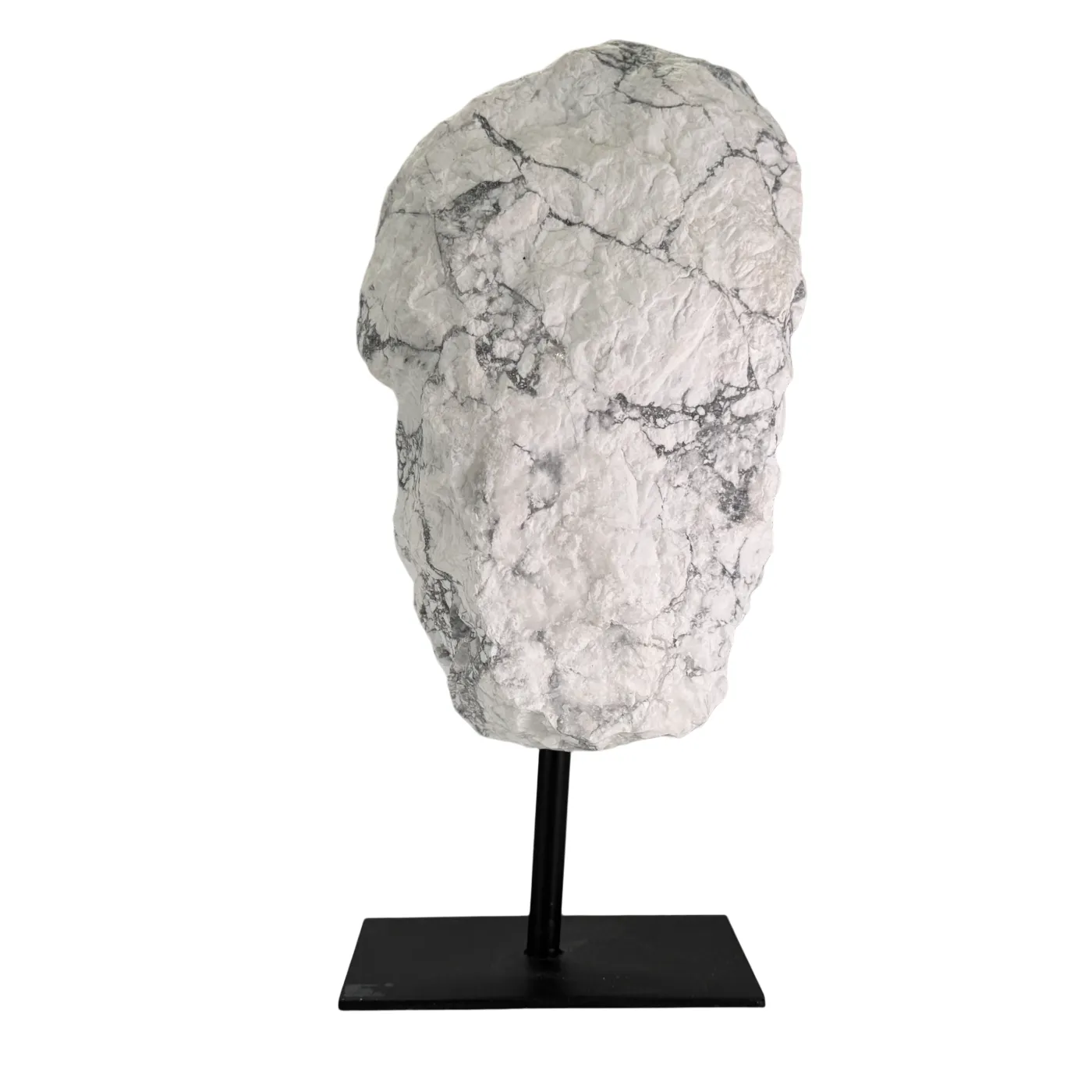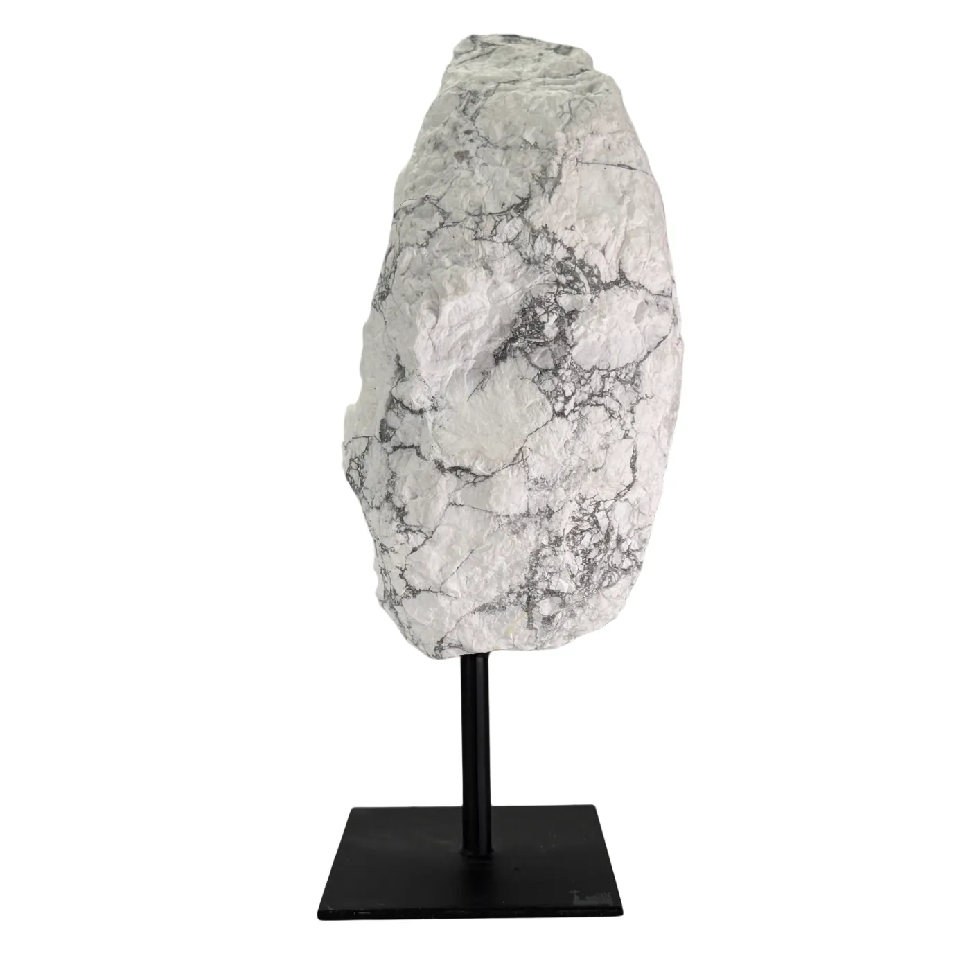 Ontdek de rustgevende uitstraling van deze ruwe howlietsteen, afkomstig uit Brazilië. De steen heeft een lichte witte kleur met karakteristieke grijze aders en staat stevig op een elegante zwarte metalen standaard.