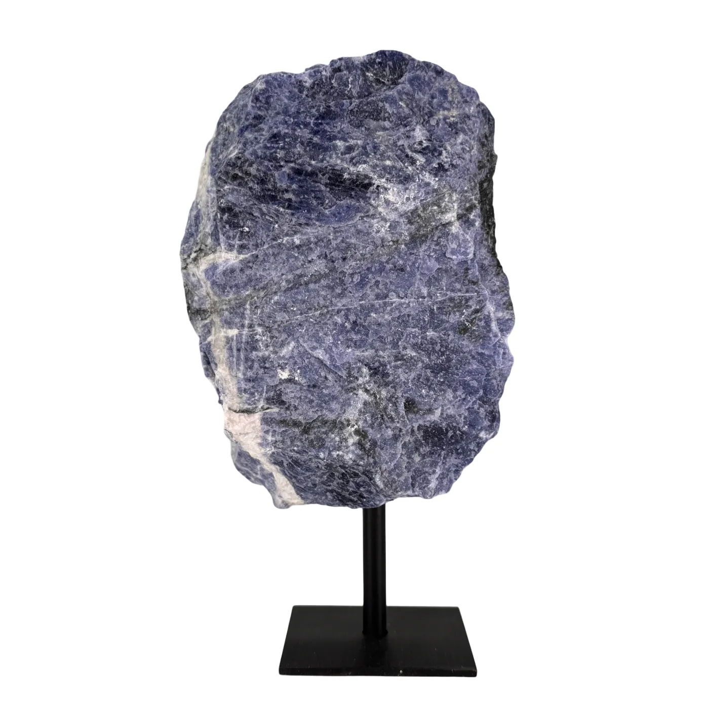 Ontdek de natuurlijke schoonheid van deze ruwe sodalietsteen, rechtstreeks afkomstig uit Brazilië. De steen heeft een blauwe kleur met karakteristieke witte aders en staat stevig op een elegante zwarte metalen standaard.