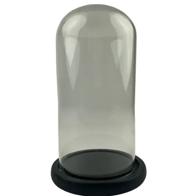 Decoratieve stolp van helder glas op een houten plateau. Perfect om jouw mooiste verzameling of decoratieve items te presenteren onder deze elegante glazen stolp.